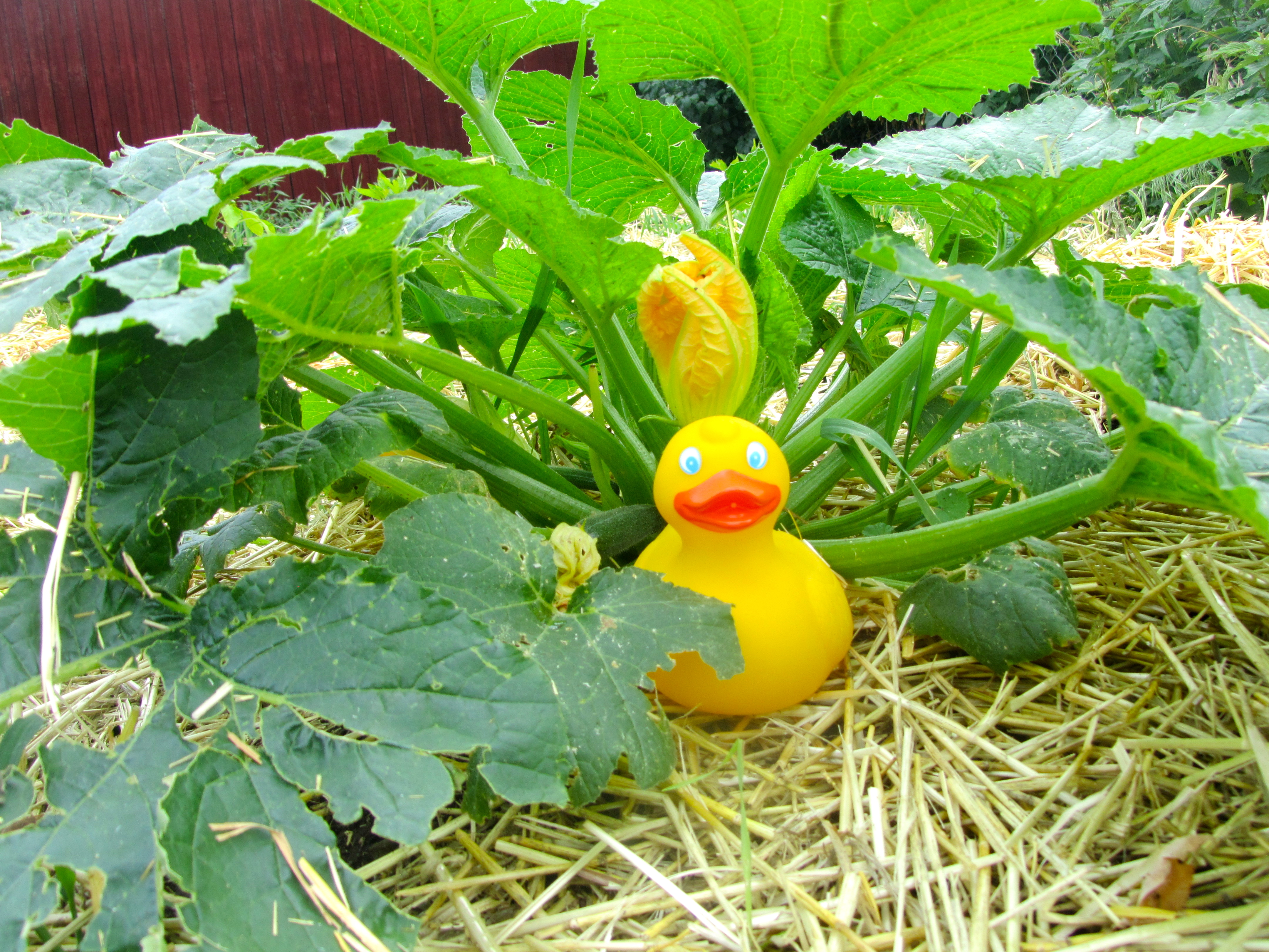 parsley and bell peppers of various colors. These were purchased as small plants. We also planted green beans, purple string beans, beets and radishes from seed. The raspberries and strawberries come back each year. The humans say corn takes too much space, so corn was purchased from various farm stands. Picking and eating fresh vegetables were enjoyable, but hours of weeding were not what I expected. Hot, back breaking labor. This duck is anxious to get back to the pool. I, of course, am willing to pose for photos as the garden progresses. I am in the raspberry plant, next to some of the first raspberries.