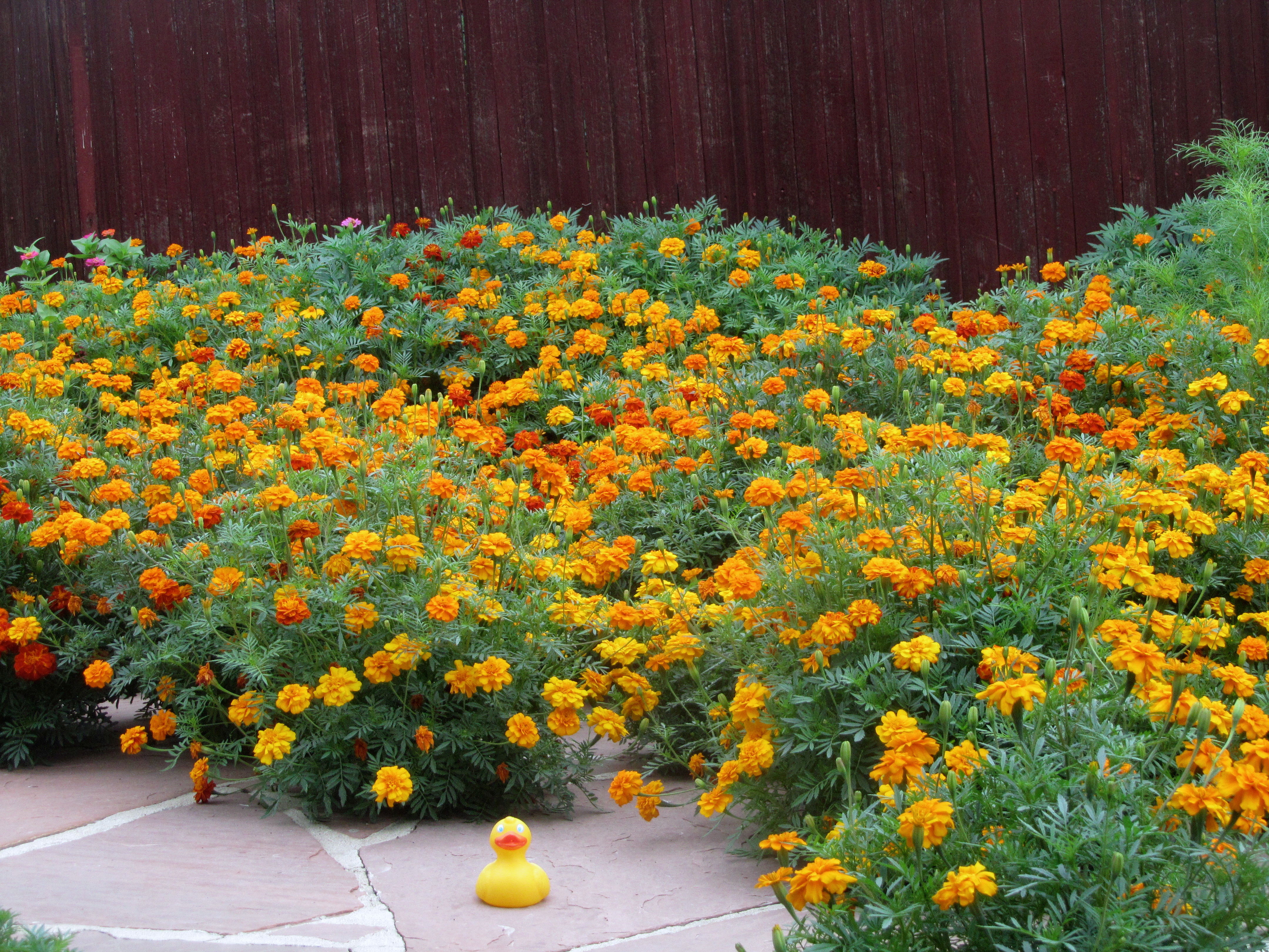 In my backyard, there are small cracks in the cement between flagstone. Marigold seeds get in the cracks and soon the marigolds take over.