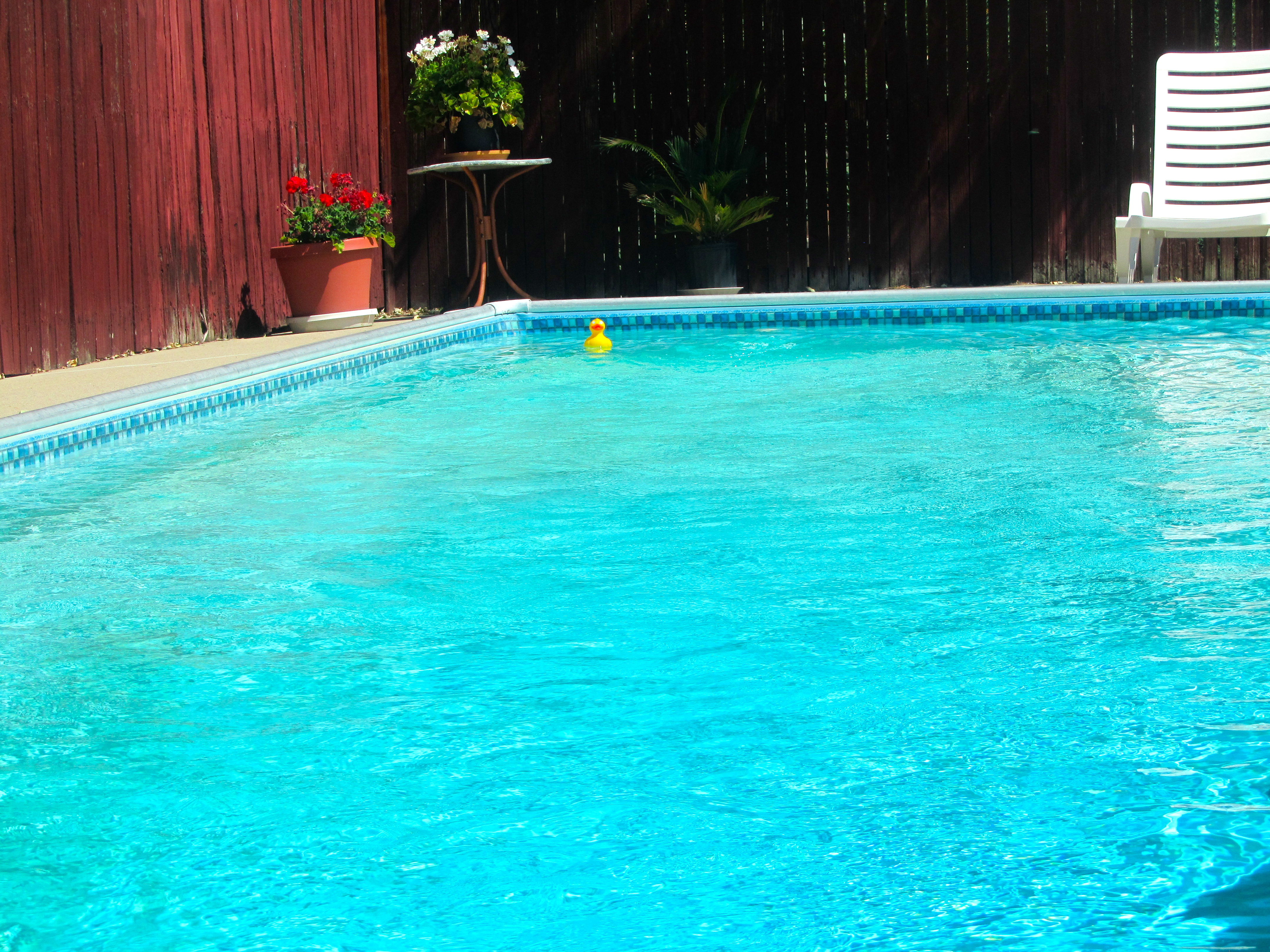 Hot days require cool water for ducks. My humans agree, so we spend much time in the swimming pool. Here I am swimming alone;