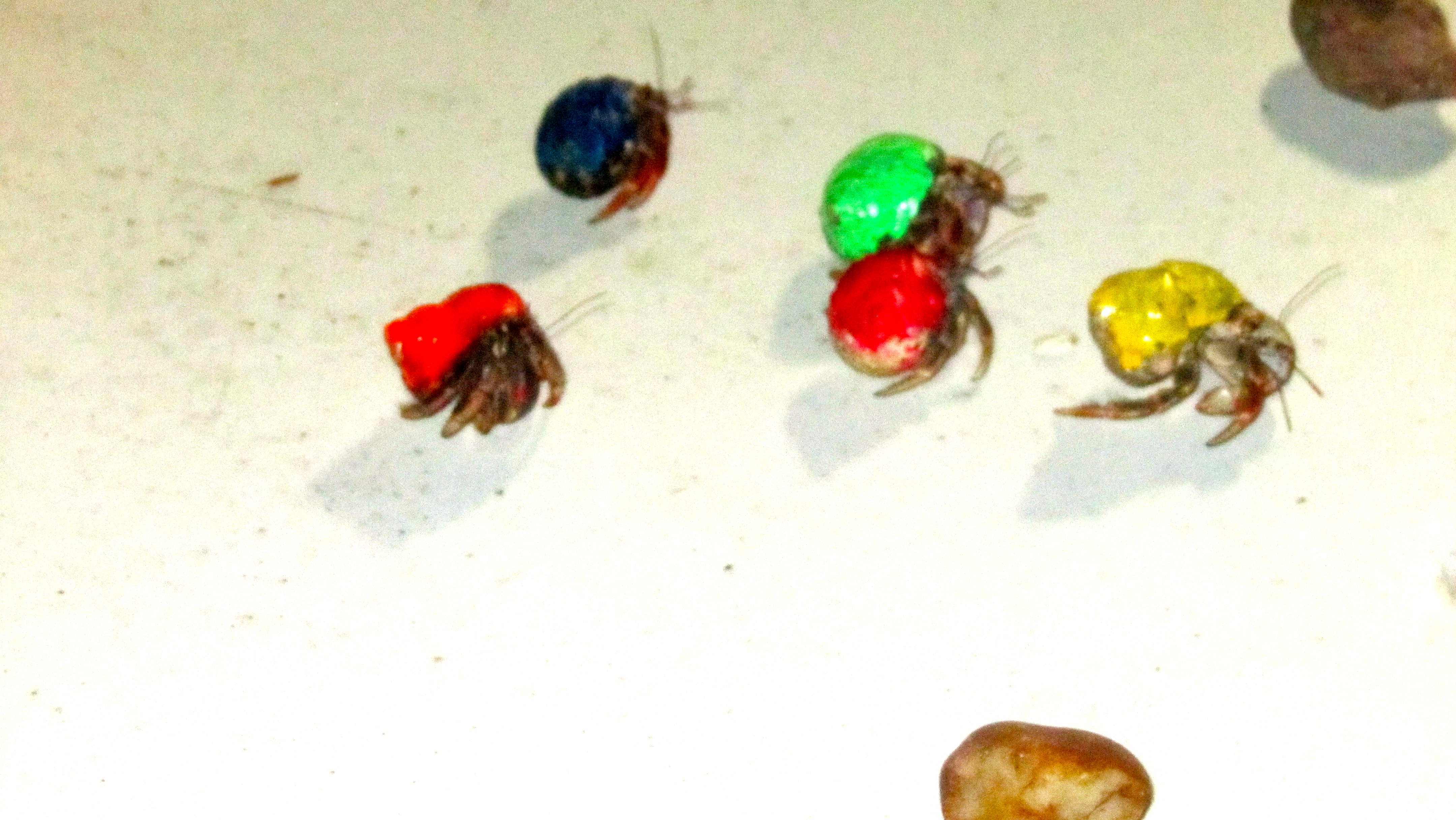 A container with 5 hermit crabs was brought out. Each crab had a different color on its back.