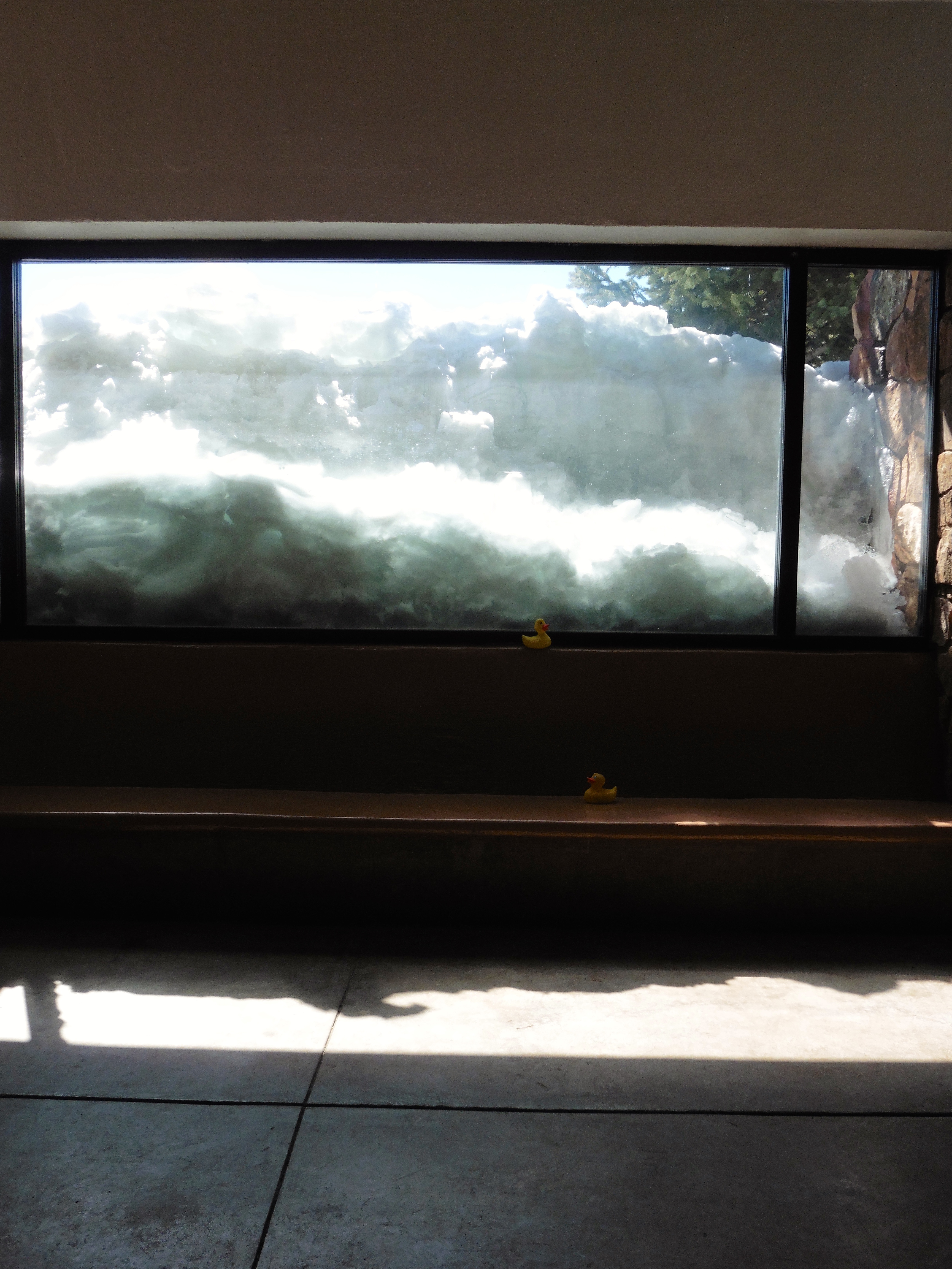 They need to tell us not to take skis and snowmobiles inside the rest area building.   That is great!   We went inside the building, but we could hardly see out the window.