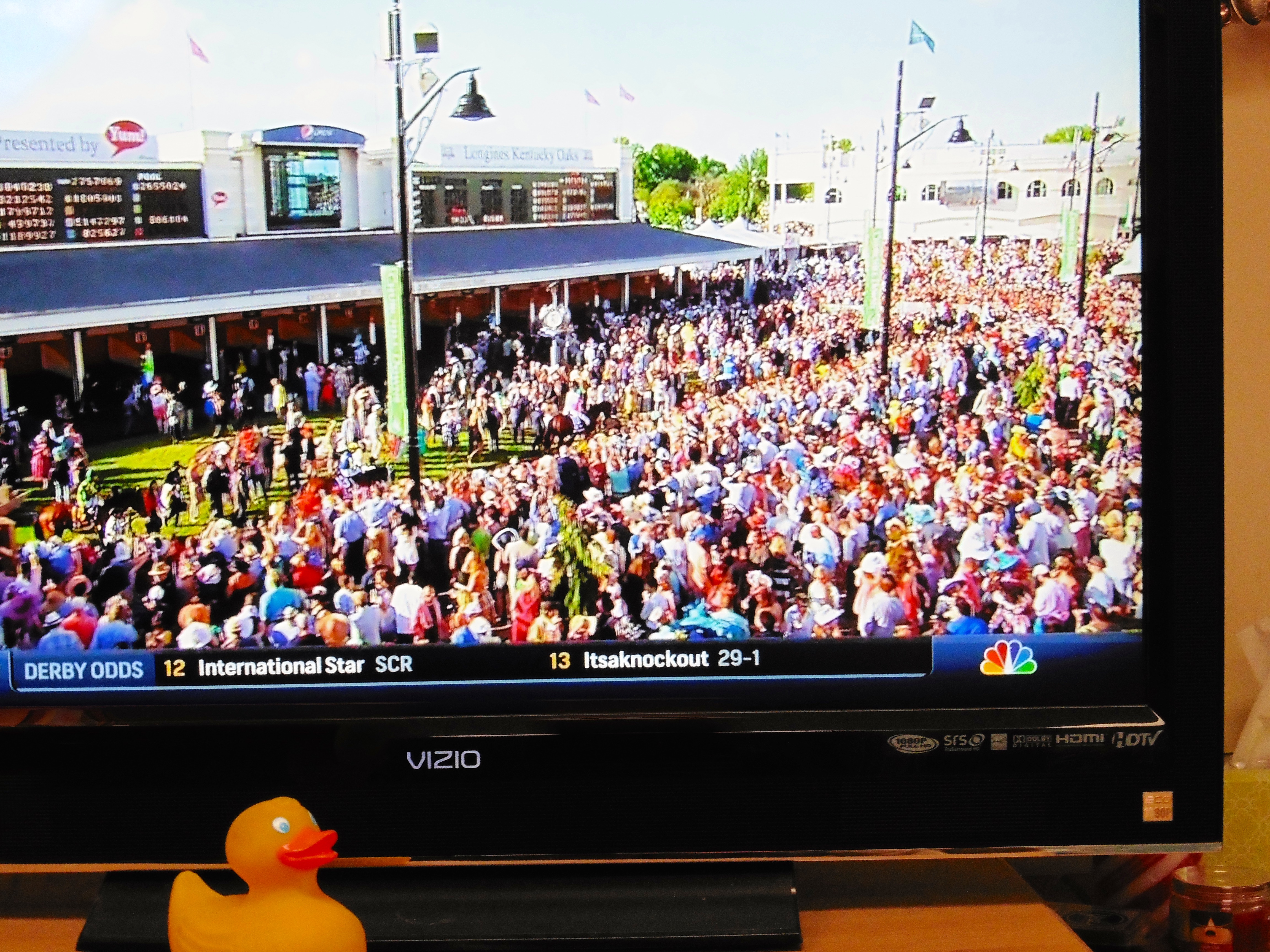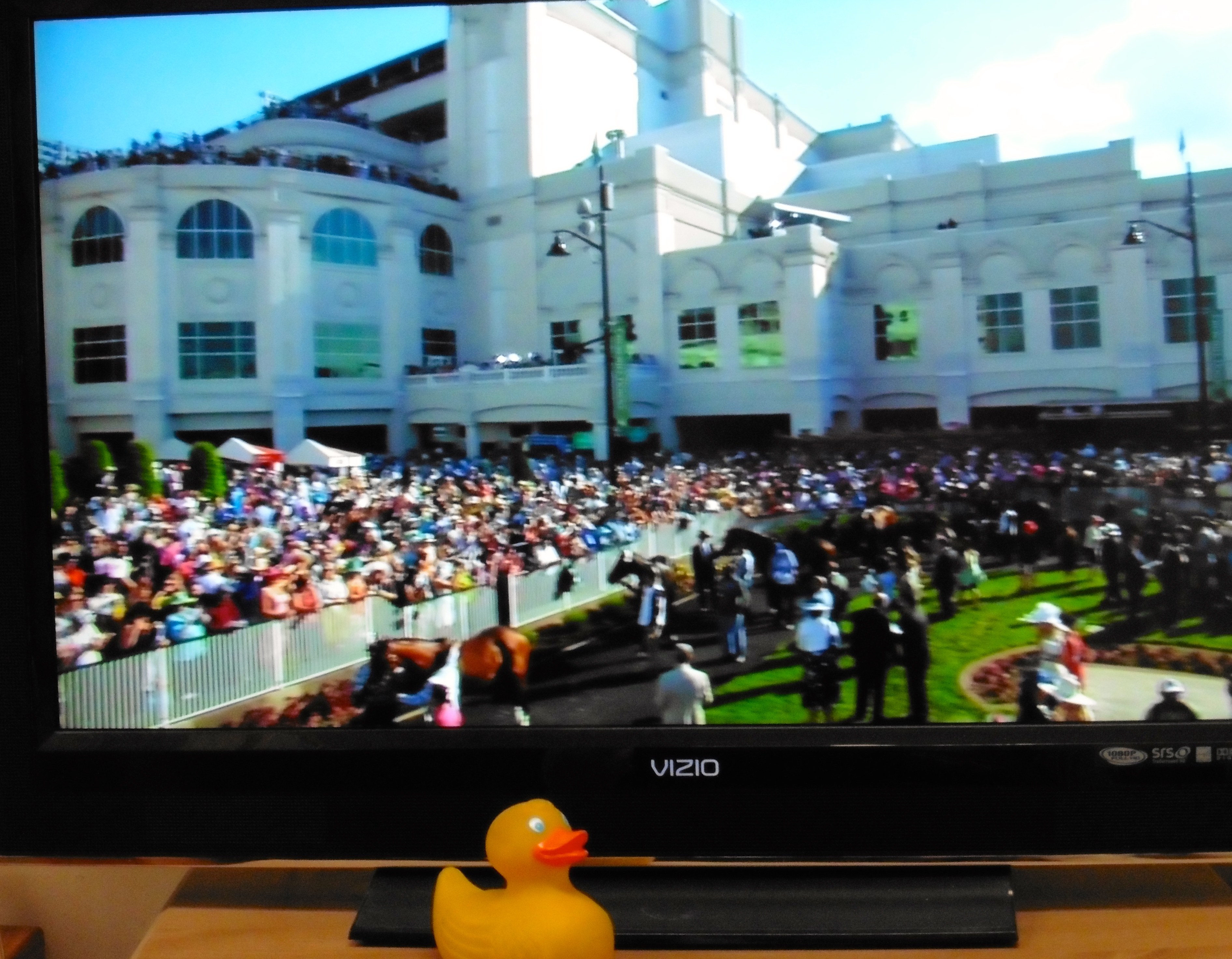 I, Zeb the Duck, watched the Kentucky Derby on television.   The first Saturday of May, the 1 ¼ mile (2.0 kilometer) Kentucky Derby happens in Louisville, Kentucky at Churchill Downs.   In Kentucky, they have two weeks of celebrating before the race.   Humans get dressed up, many wear hats and many drink mint juleps.   This is the 141st Kentucky Derby.   The first was in 1875 and the race has been held every year.  Look at this view outside Churchill Downs before the race.