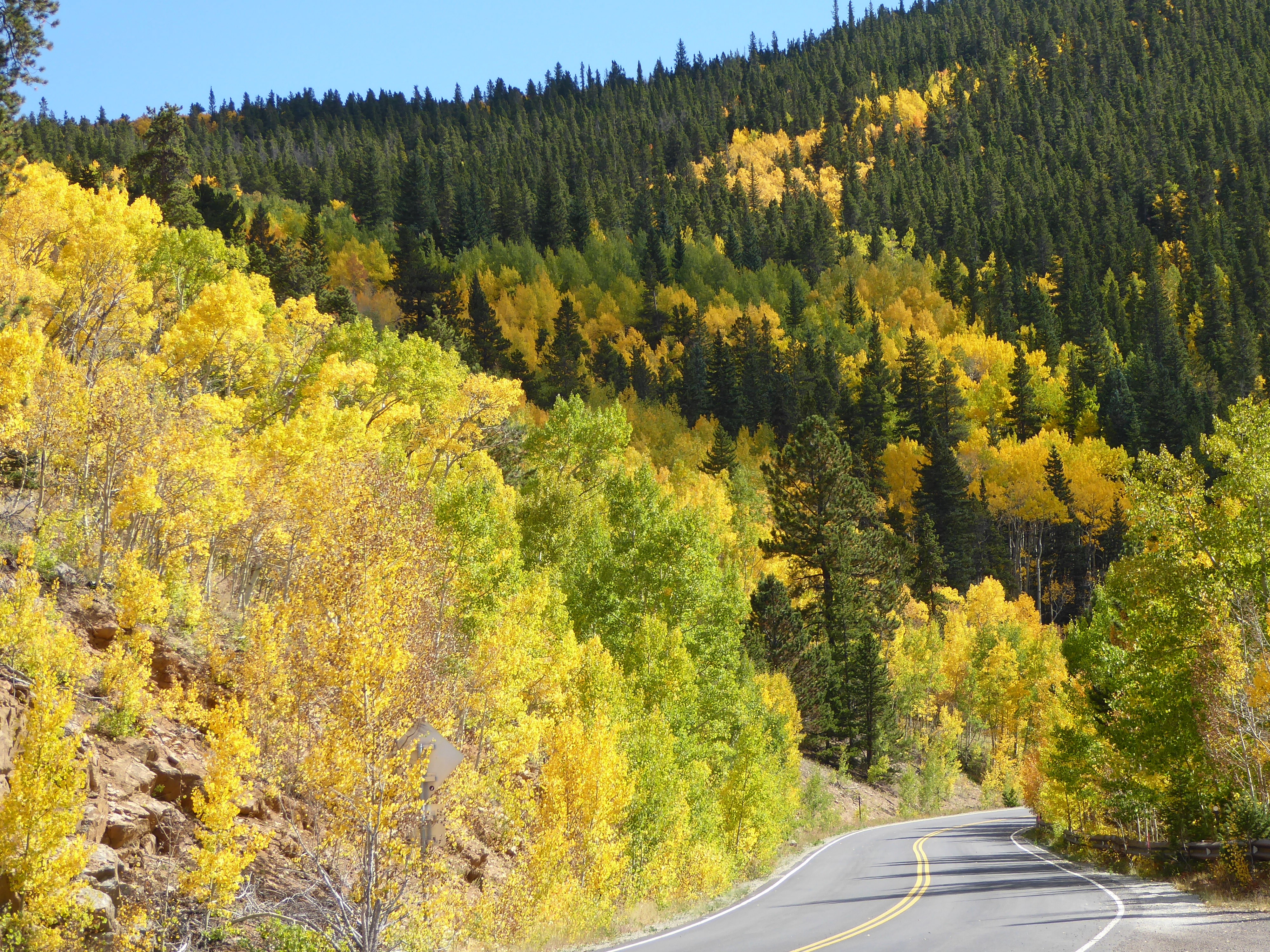Yesterday, Wednesday, according to our calendar, was the first day of autumn. Zeb and Soapy discovered autumn colors in the mountains. We went to Echo Lake, near Idaho Springs, Colorado. Driving down the road we admired the fall colors and the brilliant blue sky.