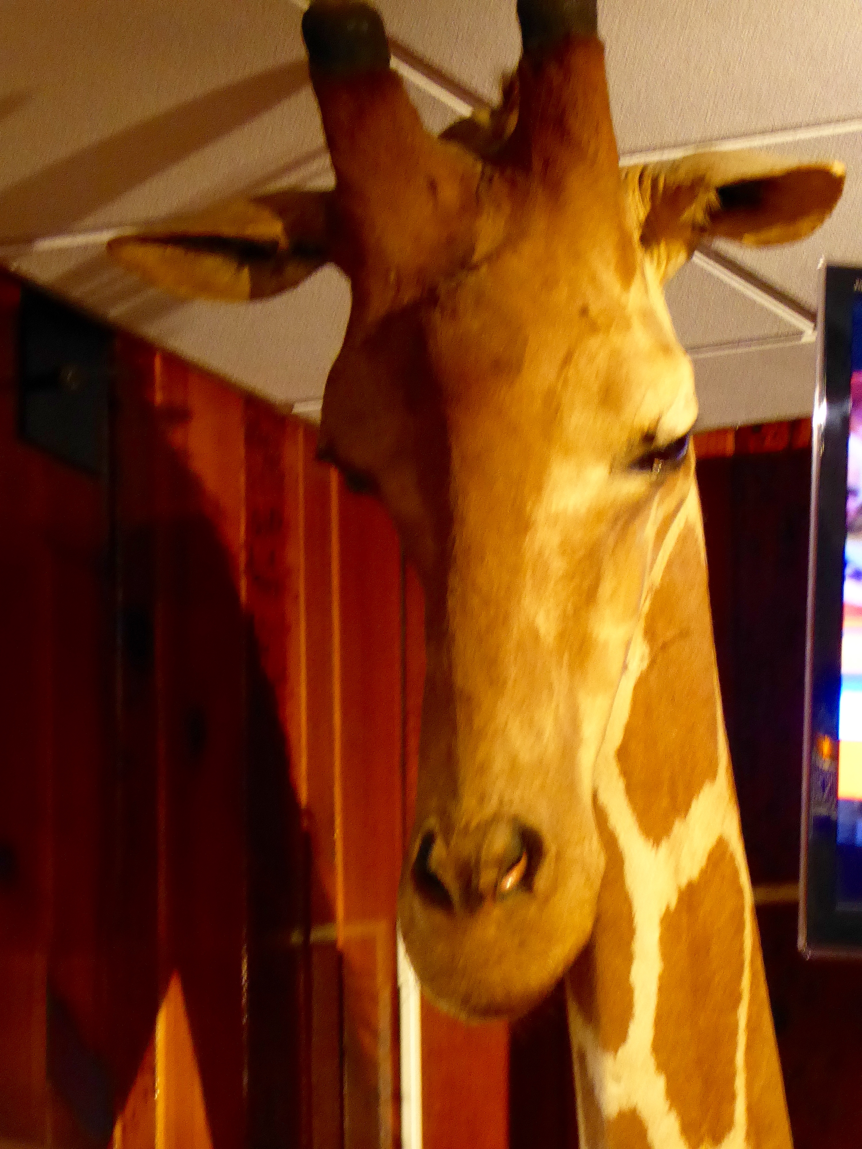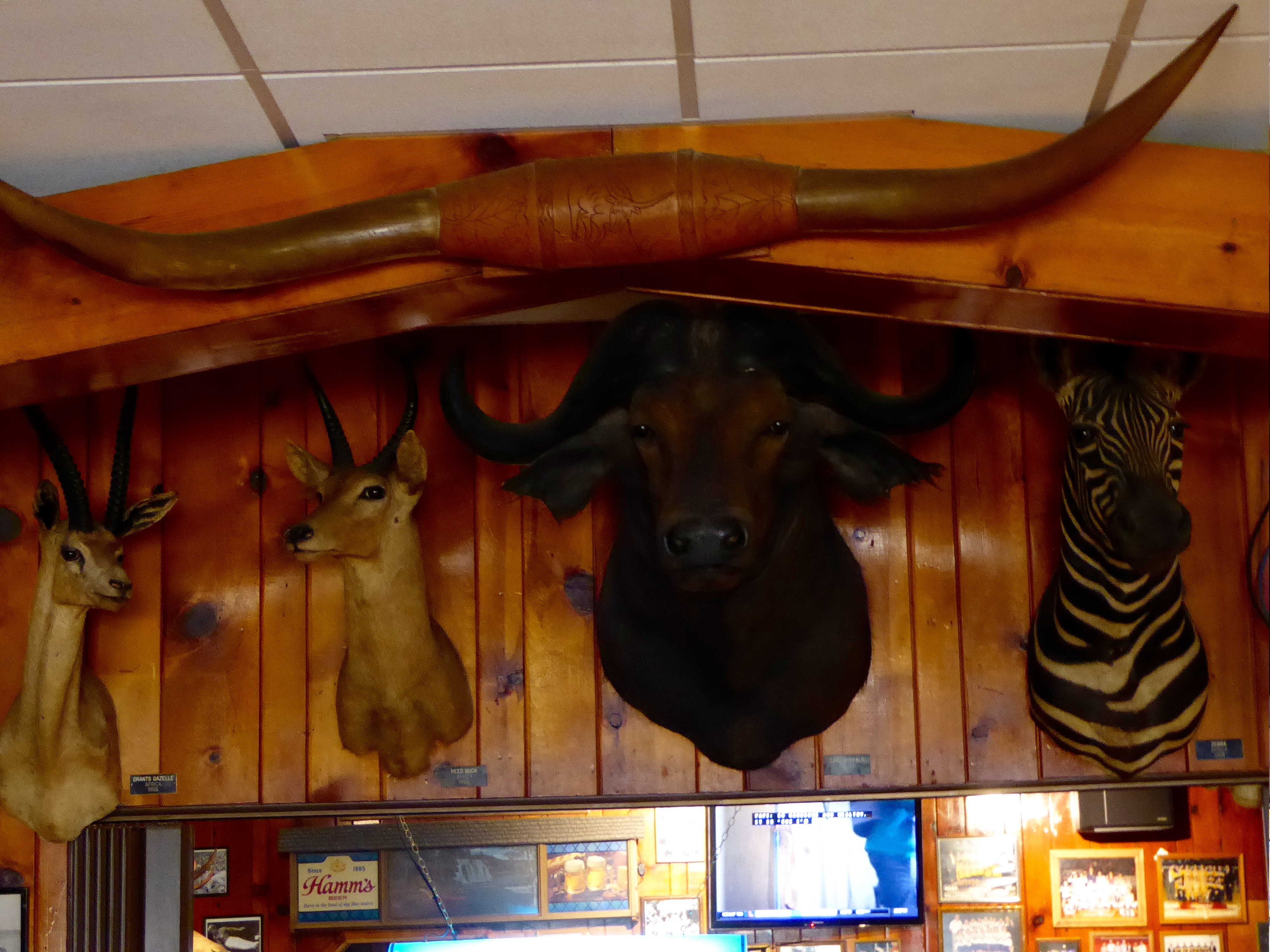 OK Mom. . .What is the story behind this restaurant?   From the front of the building we know the bar opened in 1933.   The menu tells the rest of the story.   Prohibition ended in 1933 and Rosser O. Herstedt or Ole as he was known, opened a bar on Paxton’s main street.   The bar soon became the main gathering place and hunting the main topic of conversation.   In 1938 Ole had a trophy deer mounted and displayed in the bar.   That was the beginning…  Over a period of 35 years Ole hunted on all continents and brought trophies from every trip to display in the bar.