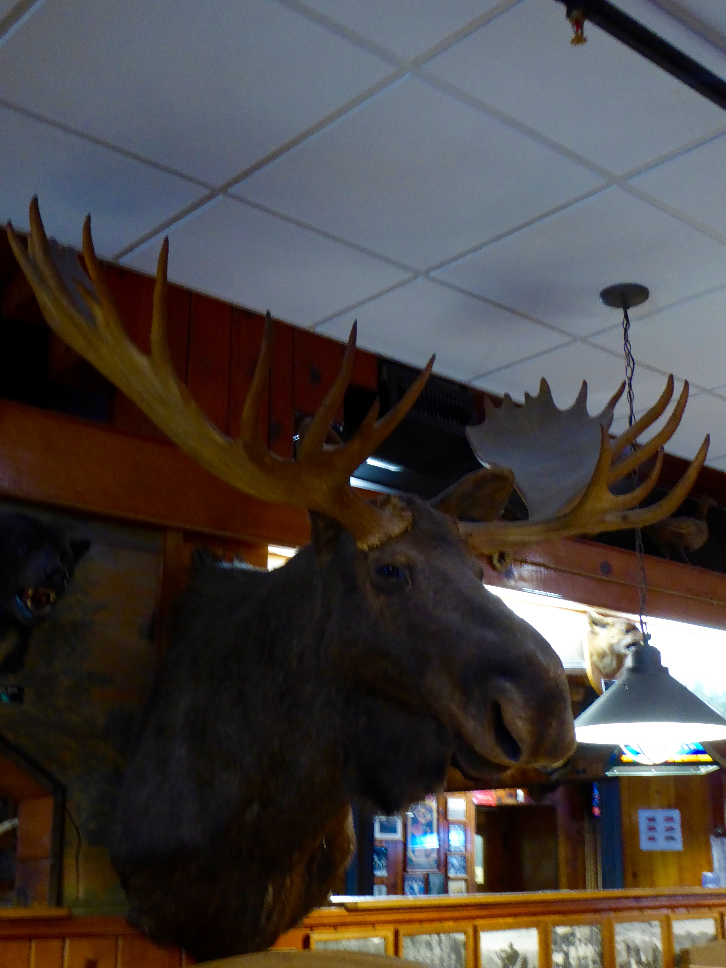 Ole made his last hunting trip in 1973, but the legend lives on.   In 1988 the bar, or lounge, was purchased by another native of Paxton, Tim Holzfaster.   The lounge and the adjoining restaurant are now combined as Ole’s Big Game Steakhouse.   The food is very good and diners view over 200 mounted trophies.   This moose watched us eat.