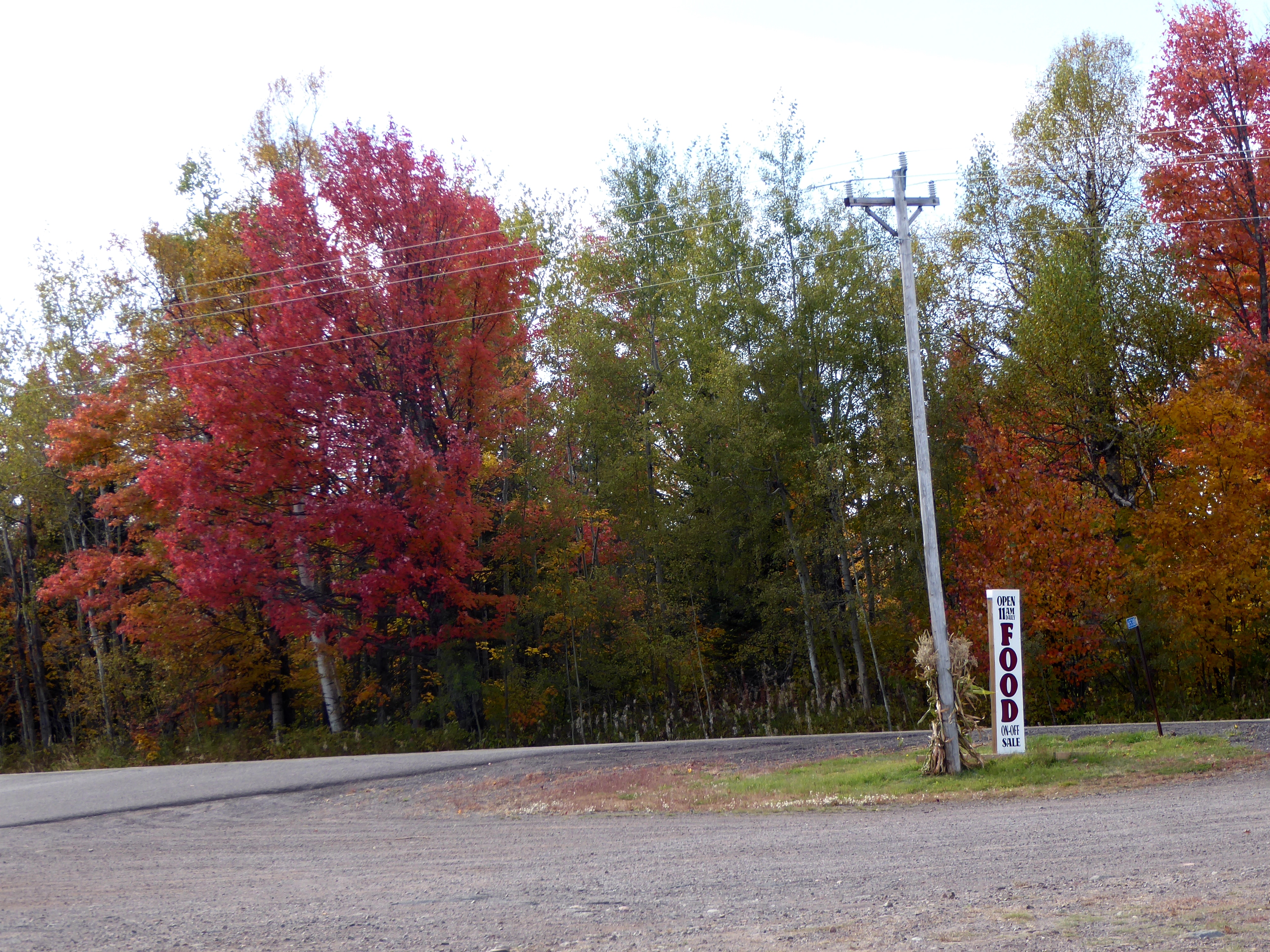 Taconite is now made into steel.   This was a great economic boost to the economy in this area.   We will now drive west, leaving Lake Superior.   Further north and inland, we would come to the Boundary Waters Canoe Area, and we are not prepared to leave our car and canoe across Minnesota.    It is  great thing to do in the summer, though.   We love the red leaves on this tree, and, of course, a sign announcing food is always a welcome sight.