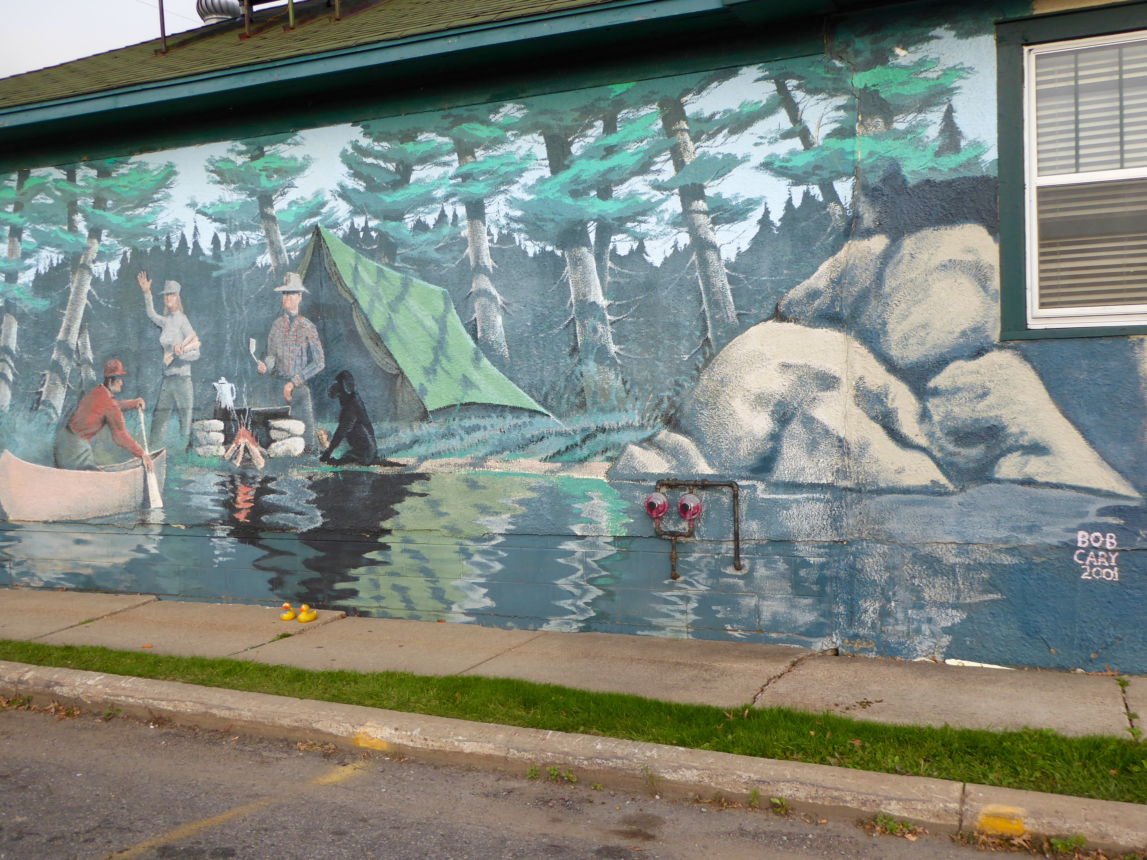 We are now in Ely, Minnesota.   Ely is a tourist town and  we saw many outfitters with stacks of canoes ready for next spring.   Here, in Ely, we admired this mural by Bob Cary in 2001.