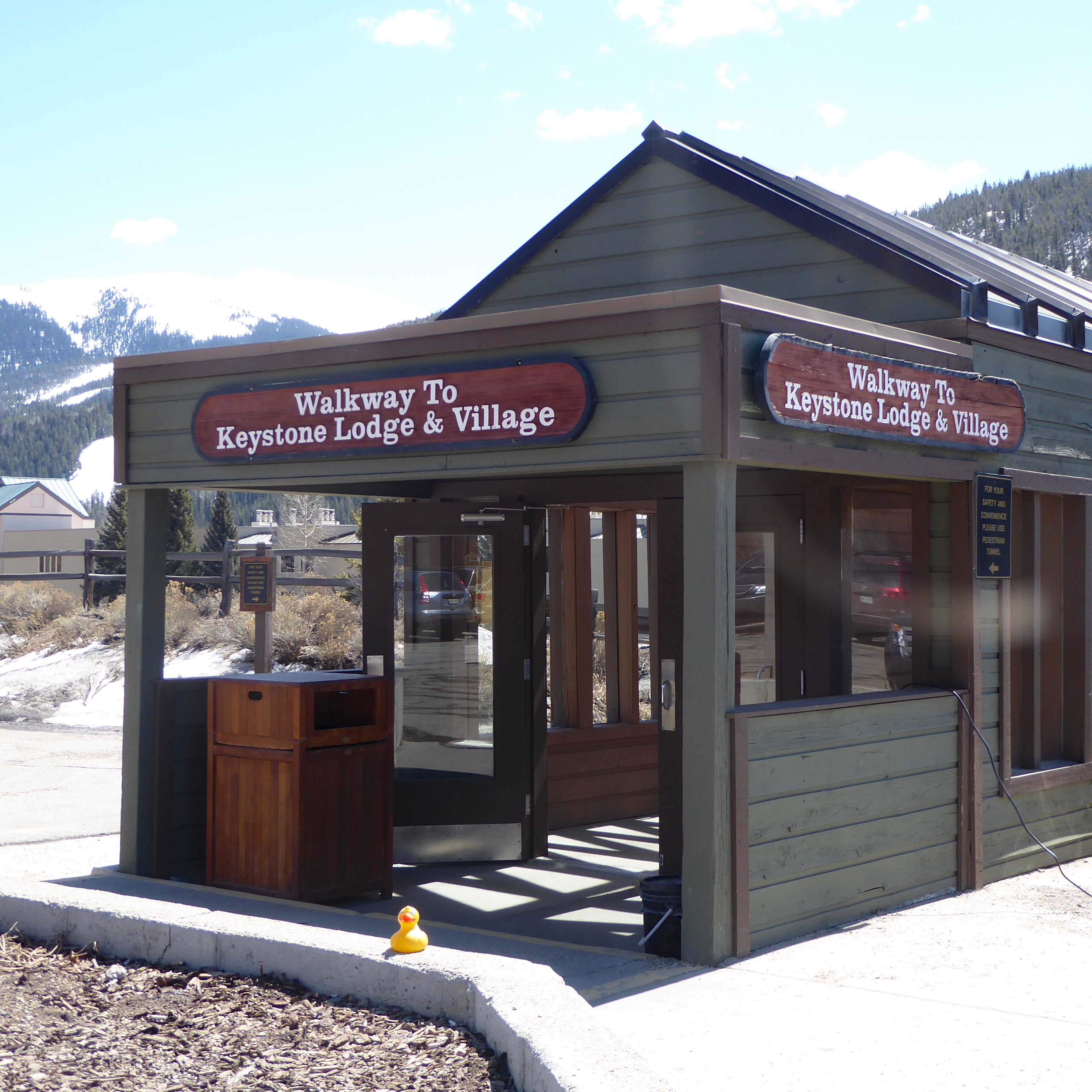 You probably know that we have had a lot of spring snow in the Colorado Rocky Mountains.   I, Zeb the Duck, knew it, but I wanted to see it.   We drove west on I-70, through the Eisenhower Tunnel and then went to Keystone Resort.   Parking in the lot across the road from the resort, we saw this building marking the entrance to the pedestrian tunnel.