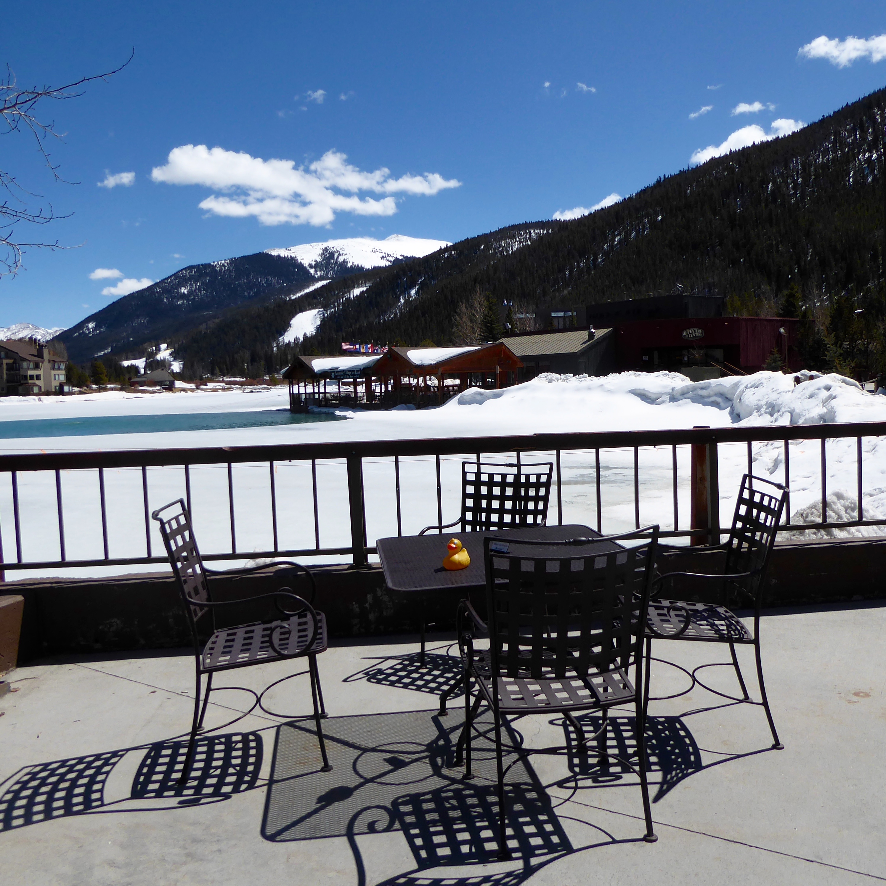 This 5 acre lake was not frozen deep enough, but when it is, this is Keystone Village Ice Rink and it is 9,321 feet above sea level.   We were not hungry, but there are restaurants here and this is our favorite table by the lake.