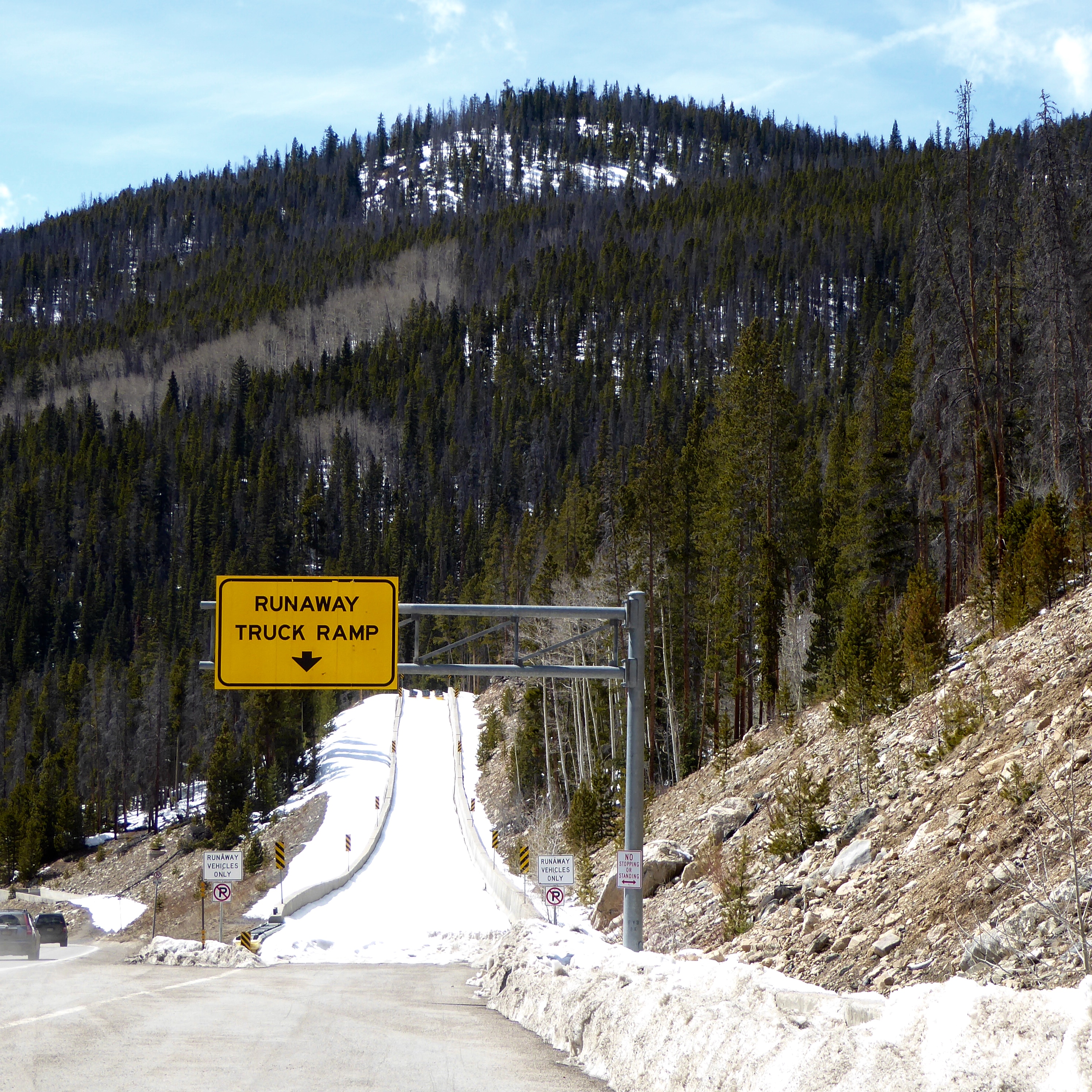 This is a run away truck ramp.   The trucks come down steep grades and can burn out their brakes.   If that happens, they enter a run away truck ramp, going up hill with a foot or two of loose sand to slow them down.   We like this one because we can see from the snow that it has not been used.   That is good that nobody had a problem.   I, Zeb the Duck, liked the spring snow in the mountains.   It was really warm when the sun was shining but rather cool when clouds came.   We really like Colorado.