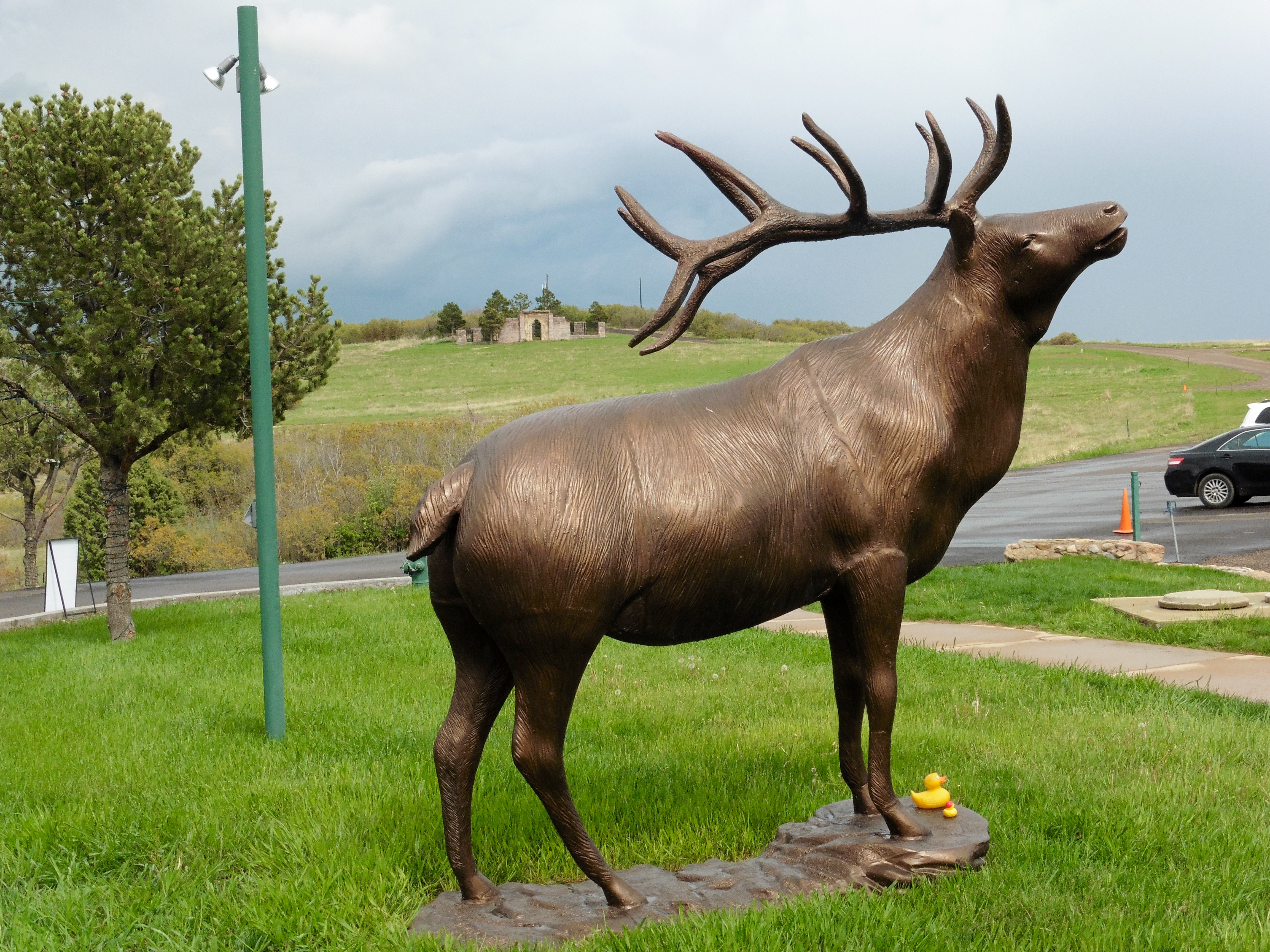 On a clear day you can see Pike’s Peak in the south to Long’s Peak in the north and beyond.   One of the most impressive views of our Rocky Mountains.   Leaving Cherokee Castle, we admired the huge statue of this elk near the castle.