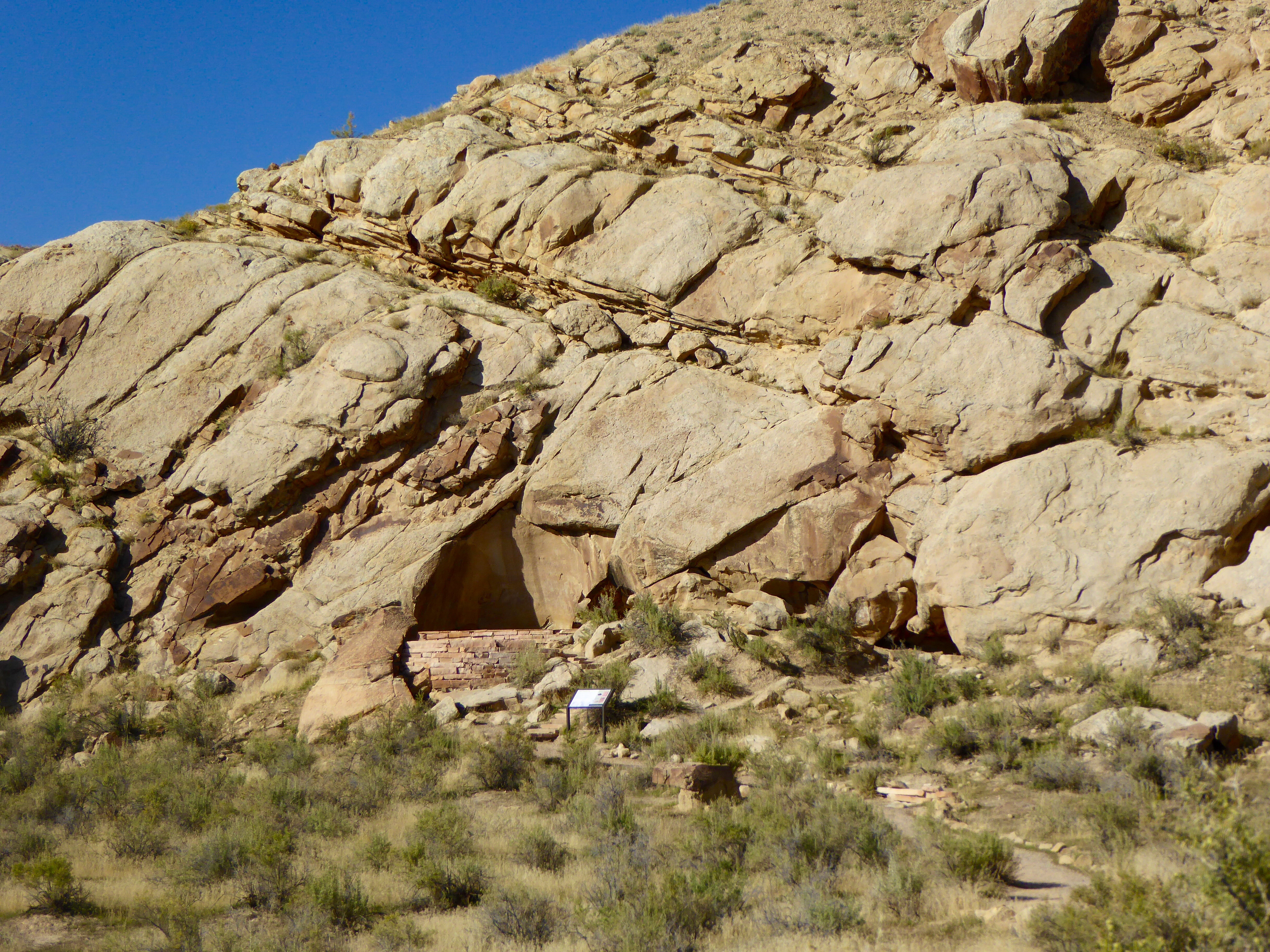Zeb and Soapy wanted to know why so many dinosaur bones are in this area. Information from The US National Park Service tells us this story. “Dinosaur National Monument includes one of the Earth’s richest known dinosaur fossil beds. These remains are from the Jurassic period 150 million years ago. During a drought, many dinosaurs died near a river’s edge. When rains returned, floodwaters carried the jumbled bones of over 500 dinosaurs, representing ten species, here. Ancient river sediments, now called Morrison sandstone, entombed the dinosaur bones. Minerals then filled the bones (though some organic material survived) and cast them in stone. Erosion eventually exposed the fossils. In 1909 Earl Douglass, of Pittsburgh’s Carnegie Museum, declared this site ‘the best-looking dinosaur prospect I have ever found.'” We drove through the national monument, stopping to see petroglyphs from the Fremont People. Let’s go to the cave and look.