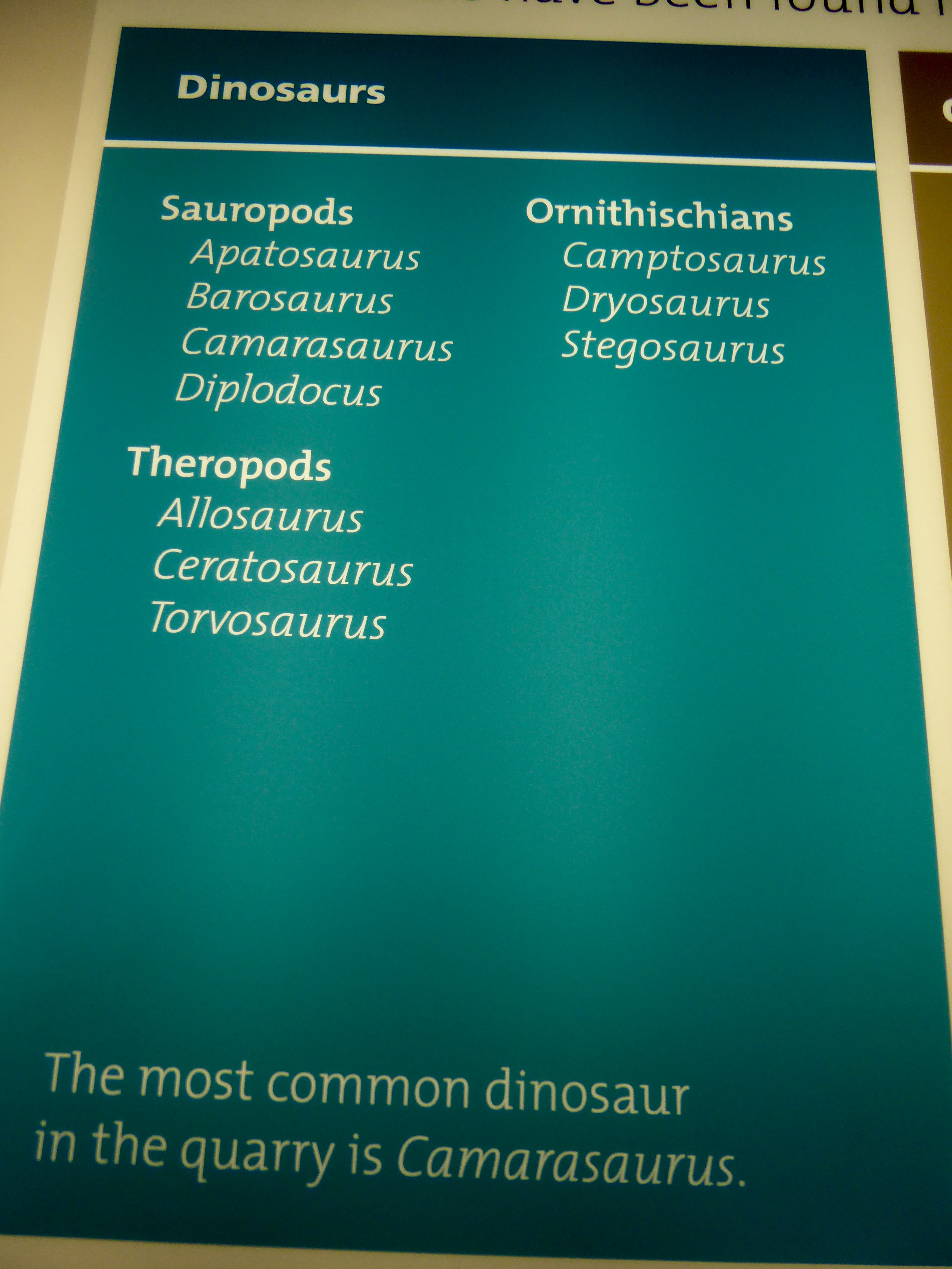This adult right thigh bone is an original Camarasaurus Femur, also from the Morrison Formation of the Jurassic Period. The Camarasaurus was the most common dinosaur in the quarry and this femur is also 149 million years old. This sign lists the dinosaur remains found in this quarry.