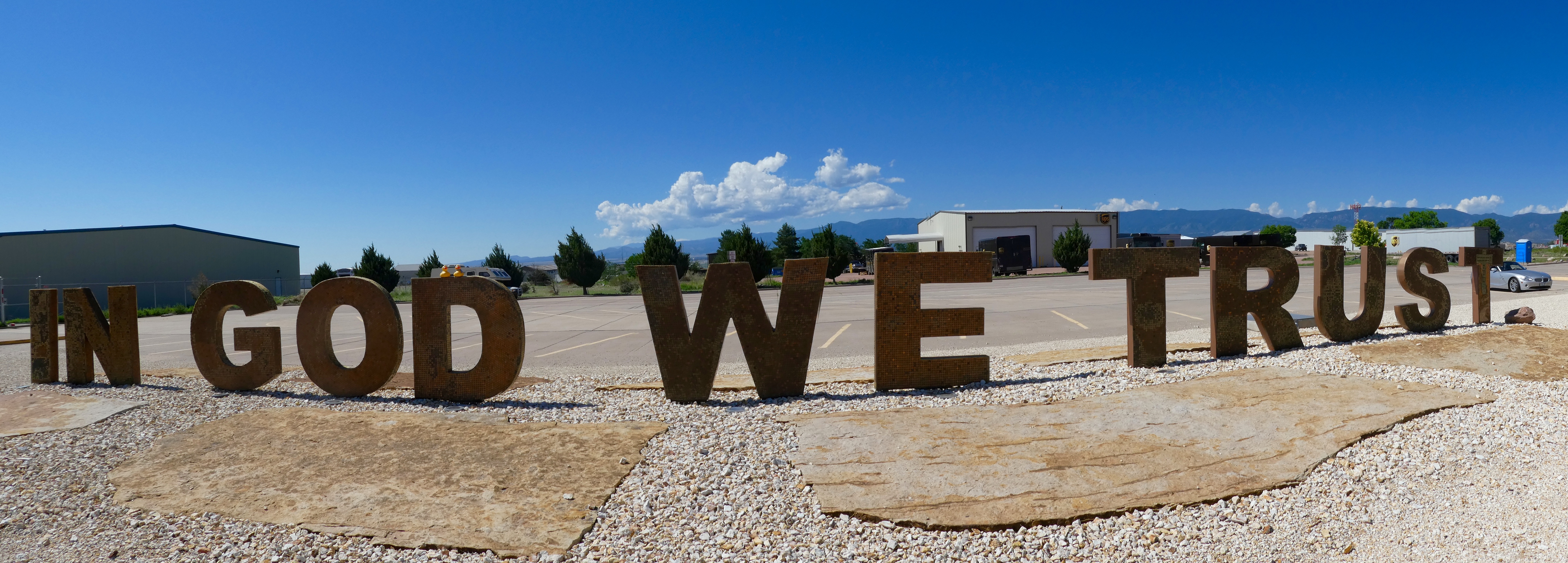 The big steel letters were made by students in the Canon City High School metal shop. Attached to the letters are pennies. The letters spelling “IN GOD WE TRUST” are covered with 58,272 glued on pennies, one for each American killed in the war. Most of these pennies were minted during 1965-1971, the war’s deadliest years.