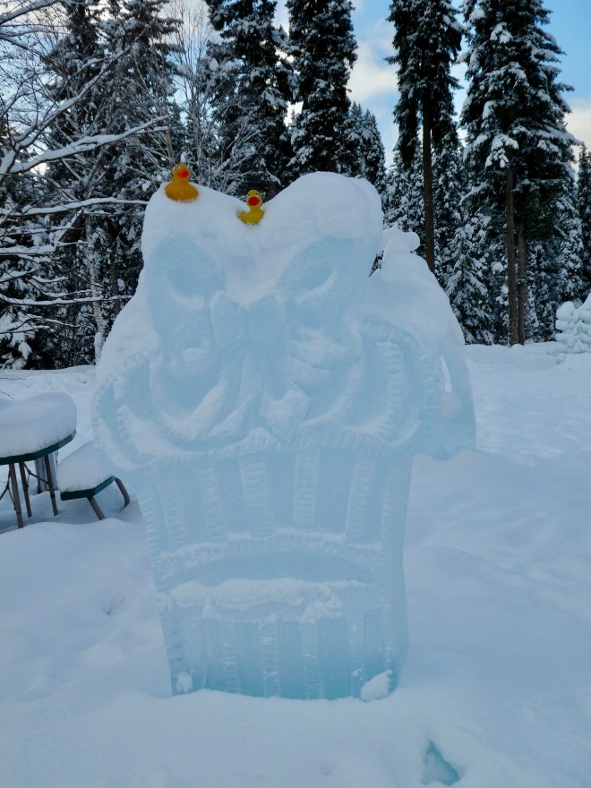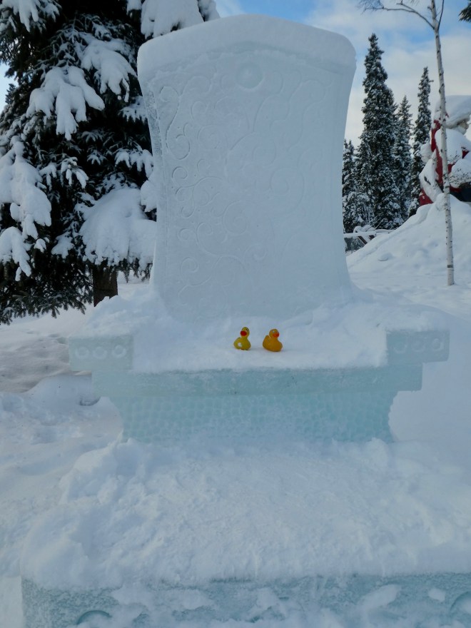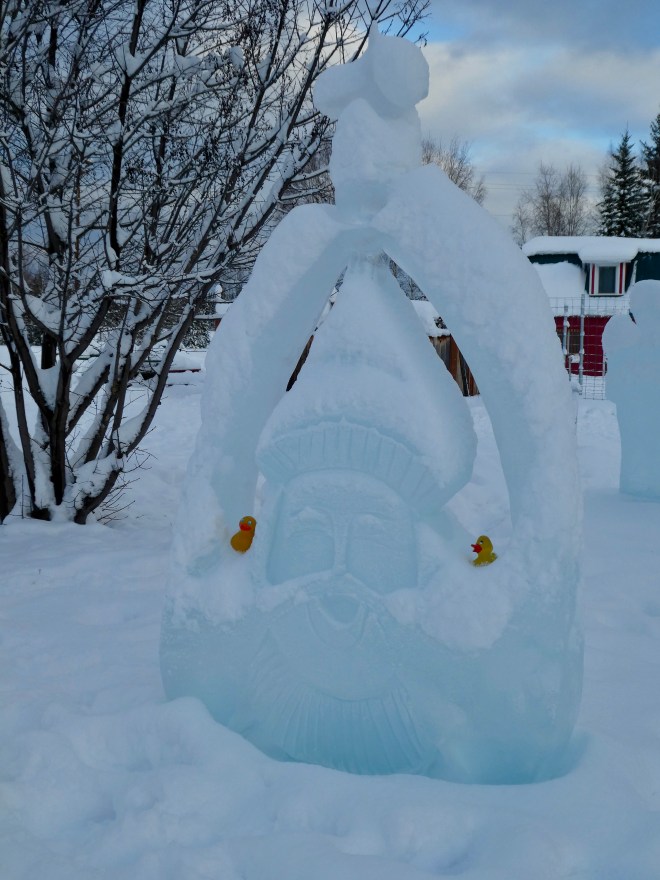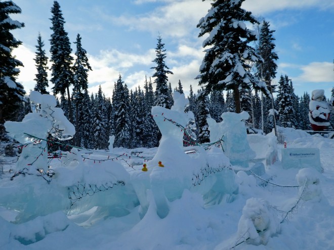 These ice sculptures have been here since mid December, without melting. The ice does have new snow, some added almost every day. Santa’s reindeer are pulling the sleigh here.