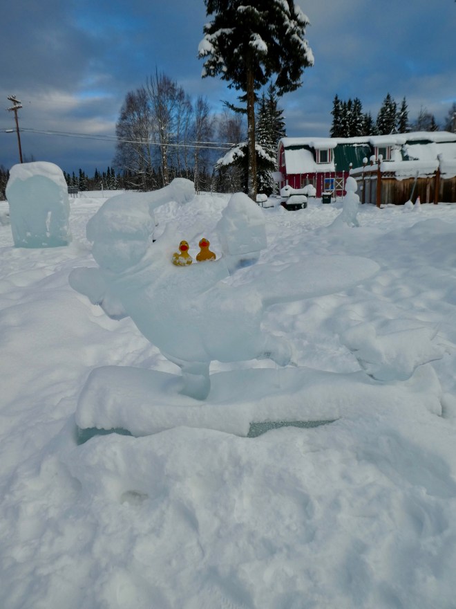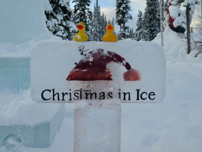 Zeb the Duck here with more from North Pole, Alaska. Last time we showed you Santa’s house. Well, behind Santa’s house, near the reindeer herd, is a Christmas in Ice park.