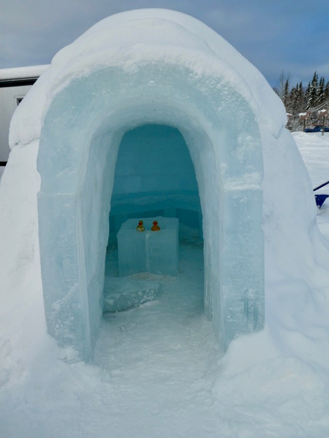 Did you know, people in Alaska do not live in igloos. But sometimes it makes a good story. Here we go. Zeb and Eider gliding on ice.