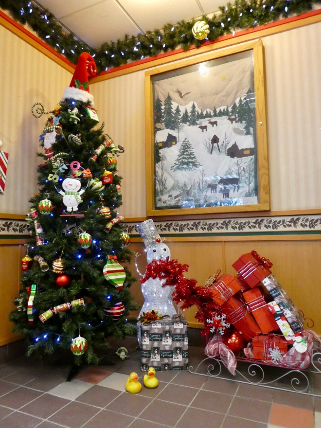 This Christmas tree, presents, and even the picture on the wall remind us that every day can be like Christmas. Even the trash can were decorated for Christmas.