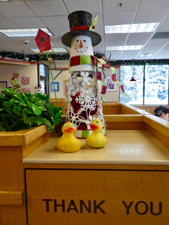You might correctly guess that after sitting on all that ice, I, Zeb the Duck and cousin Eider Duck are getting cold feathers. We told mom and her friend that we wanted to sit in Santa’s chair.