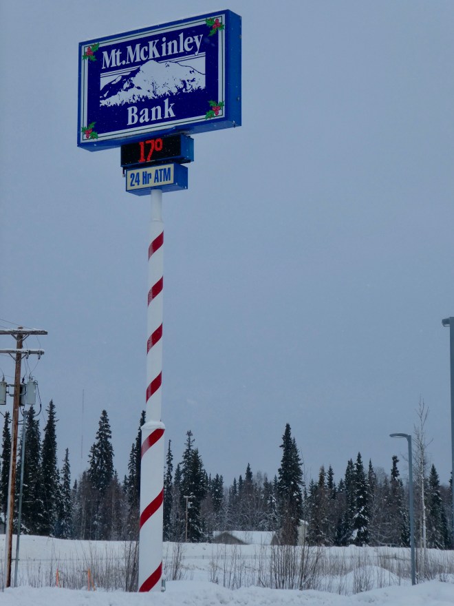 Yes, that temperature is correct. The weeks before we arrived, the temperatures were well below 0. Often -35 degrees F. Brrrr. But when we were there, the temperatures were above zero, often in the 20’s. That 17 degrees on Mt. McKinley bank sign is correct. We stopped at Wendy’s and it seemed like Christmas.