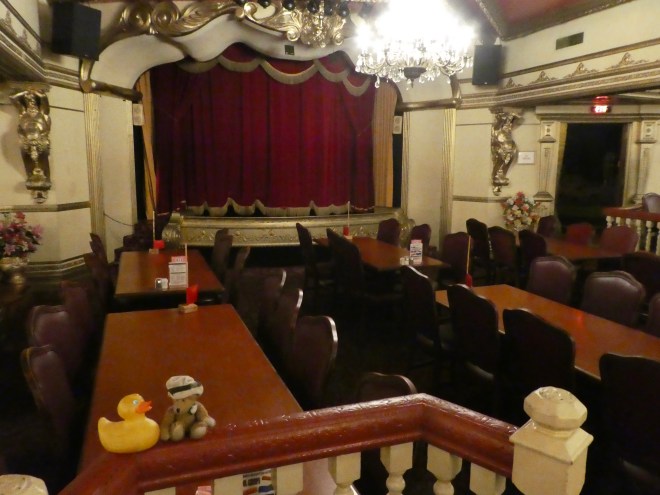Maybe we are performing here? The stadium style seating is nice, but we are sitting under a gorilla to watch the puppet show?