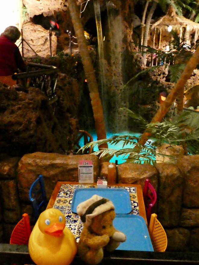 Inside, this restaurant looks like Greece. Or so our moms say. We ducks have not been to Greece, but our moms visited before we ducks were part of the family. Outside is the hot desert, but inside we gaze at this cool looking harbor.