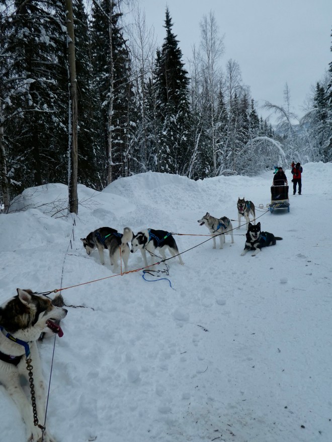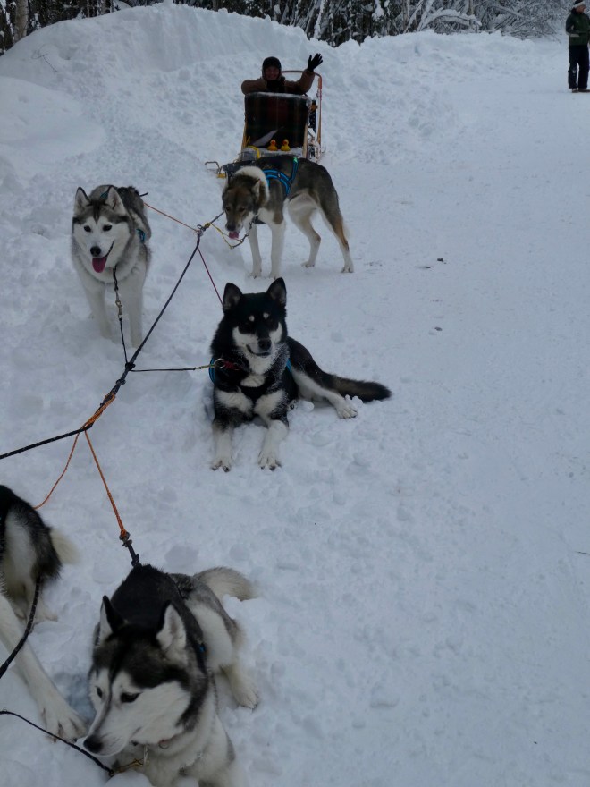This is Avett, one our dogs. While riding, Nita, our guide and musher, stood behind the first sled and guided the dogs. We rode with mom, standing on the back of the second sled. Standing gave us a great view, and wasn’t as cold as sitting so close to the snow. Mom stood, with her knees bent, on the ride. She said it felt like water skiing. During our ride we did not take photos. We were moving fast; going up and down small hills, and over frozen creeks. Dog sleds on ice feel a little different. During turns, Nita told us how to lean to make things easier for the dogs. We loved our ride. Here we are, sitting on the first sled, exhilarated after our exciting and wonderful tour.