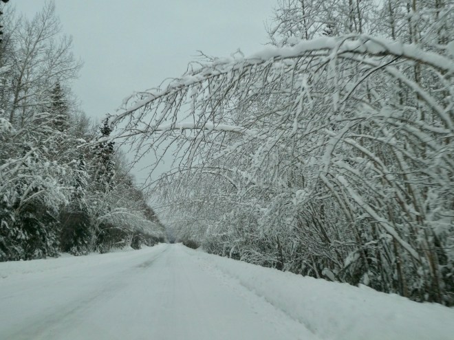 This photo came from Sirius Dog web page. The only time we were on the trails with dogs, we were on the sled. These winter sled dog tours are available from Sirius from November through March. We hope you enjoy a dog sled ride soon. Of course, they are available in Alaska, but many other locations also. They are offered in Colorado, in many of our ski areas. We had never been on a dog sled before, and we love it! Maybe again sometime? Driving back home, we again drove on snowy roads and under branches, bent from the heavy wet snow.