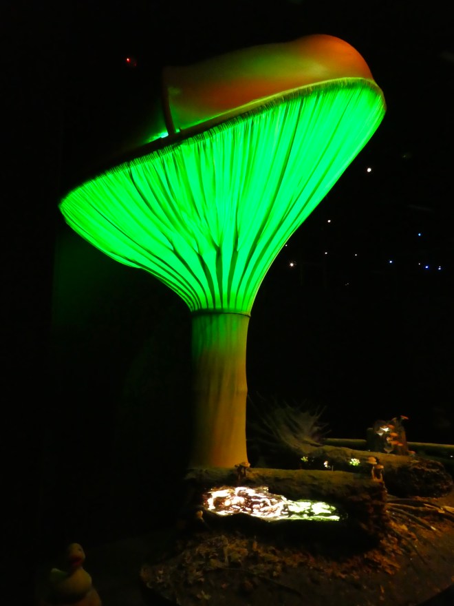 Let’s explore! That is a giant firefly. You will notice that it is dark in here, so pictures of us with these lighting creatures just doesn’t work well. So what does this bioluminescence mean? Bioluminescence is visible light generated by a living organism through a chemical reaction. Eighty percent of all bioluminescent groups are in the world’s oceans. Not so many on land. There are some fungi and insects, but no flowering plants, birds, reptiles, amphibians or mammals that glow. Look at this glowing mushroom.