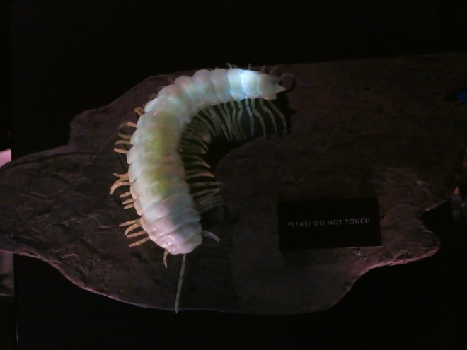 It exists in eastern North America, where it grows on decaying wood in the forests. This is a huge model of the mushroom. They are really much smaller, just a normal mushroom size. And a glowing variety of a millipede.