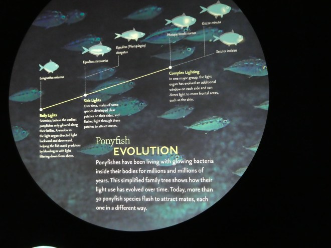 In the cave, fungus gnat larvae drop sticky “fishing lines” from the cave roof. Glowworms give the light and the sticky lines attract and catch food. Most glowing creatures are found in the ocean. Ponyfish also glow. Here is the sign that explains a little about the glow.