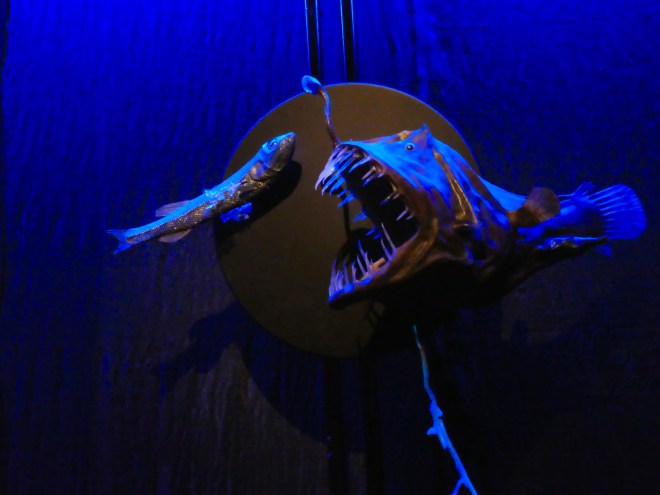 The jelly fish have both bioluminescent and fluorescent lighting. This female anglerfish is a serious predator.