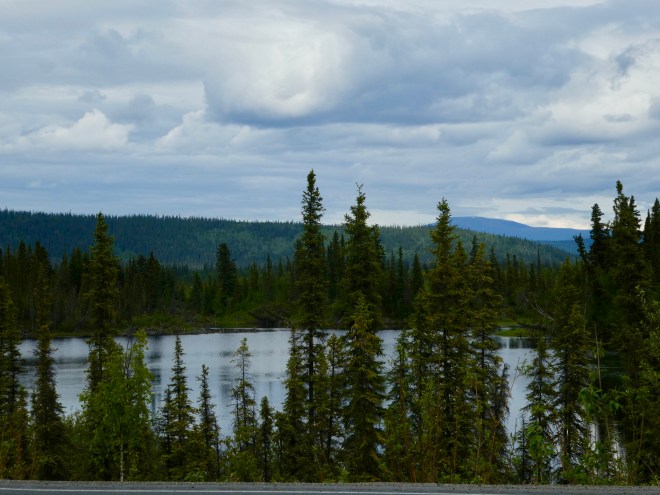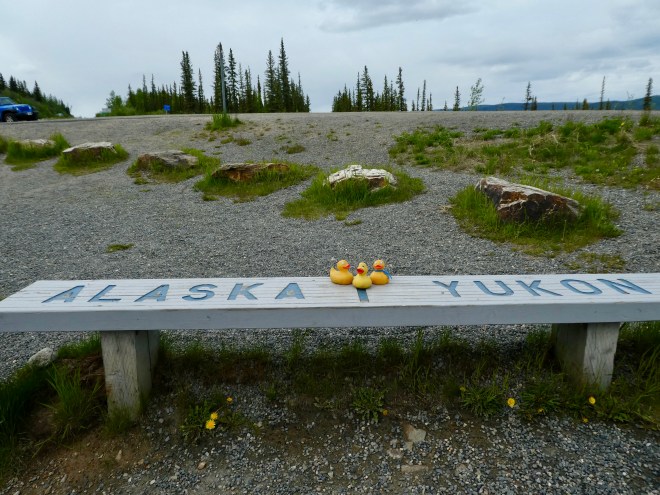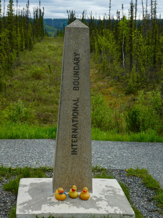 Our adventure begins. Now the highway is paved all the way. Didn’t used to be paved. Really hard on tires and windshields then. We are told there are enough gas stations, but always stop. The next one might be closed. Several campgrounds and some motels. A couple times we quickly stopped as huge Alaskan moose crossed the road. They were too quick for us to get cameras. The terrain was hilly with mountains to the south, toward Valdez and the end of the TransAlaskan Pipeline. Best part was only seeing another vehicle every 15-30 minutes. So peaceful. About 200 miles (500 km) from Delta Junction, we reached the Canadian border. We will enter Canada’s Yukon Territory.