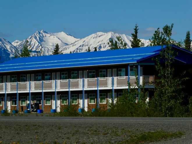 We love these views. Driving another 10 miles, we stop at the official customs station. The official was very nice and efficient. We decided to stop in the first Canadian town. This is Beaver Creek. Our Alaska travel planner, The Milepost, says Beaver Creek is the most westerly Canadian community. This is our motel, 1202 Motor Inn.