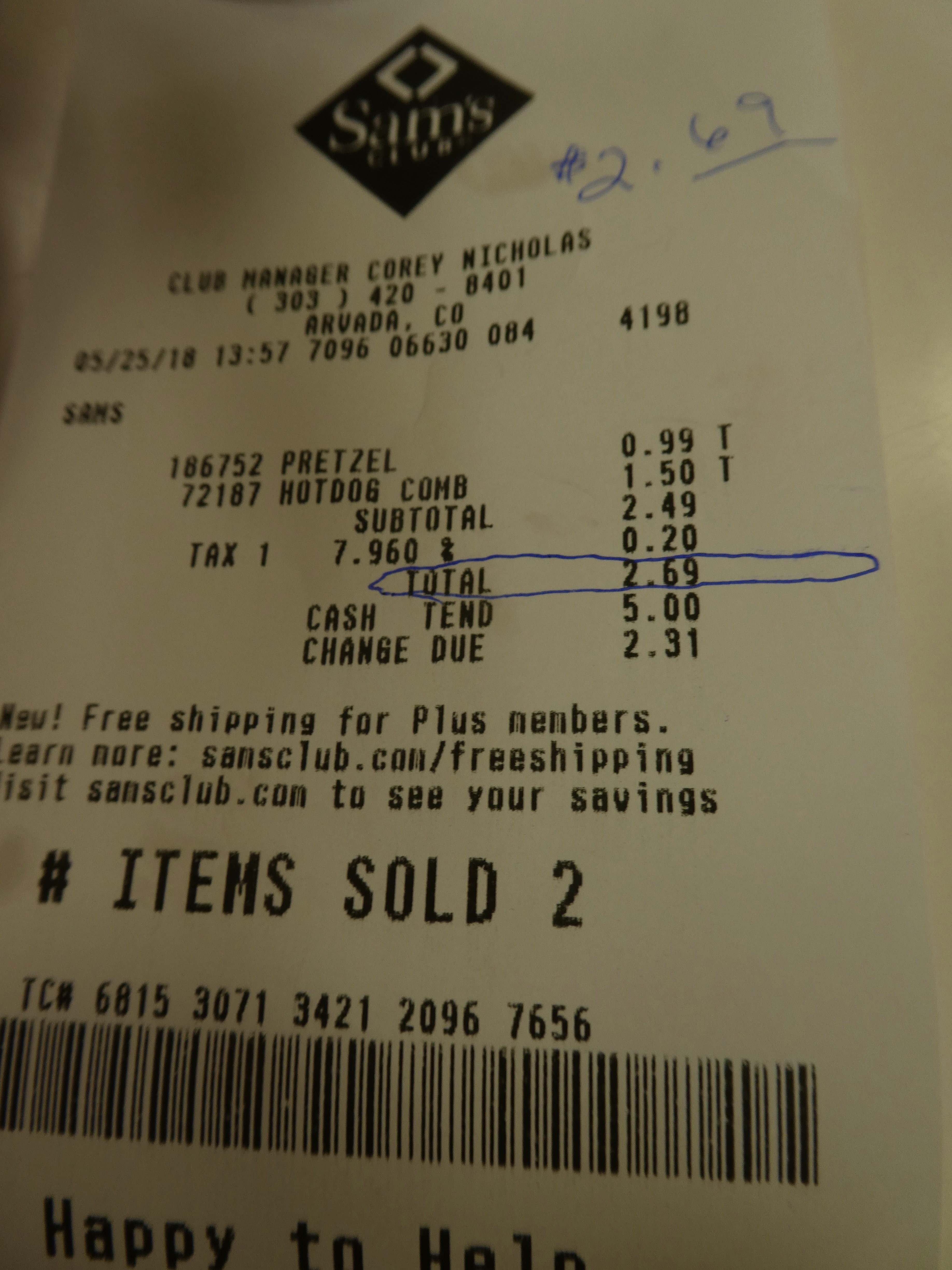We, the Colorado Traveling Ducks, and humans have memberships to Sam’s Club. This is part of Walmart corporation that sells in larger quantities. We shop there, and often after shopping, we have a quick lunch. Today we ordered a hot dog, a soft pretzel, and a soft drink.