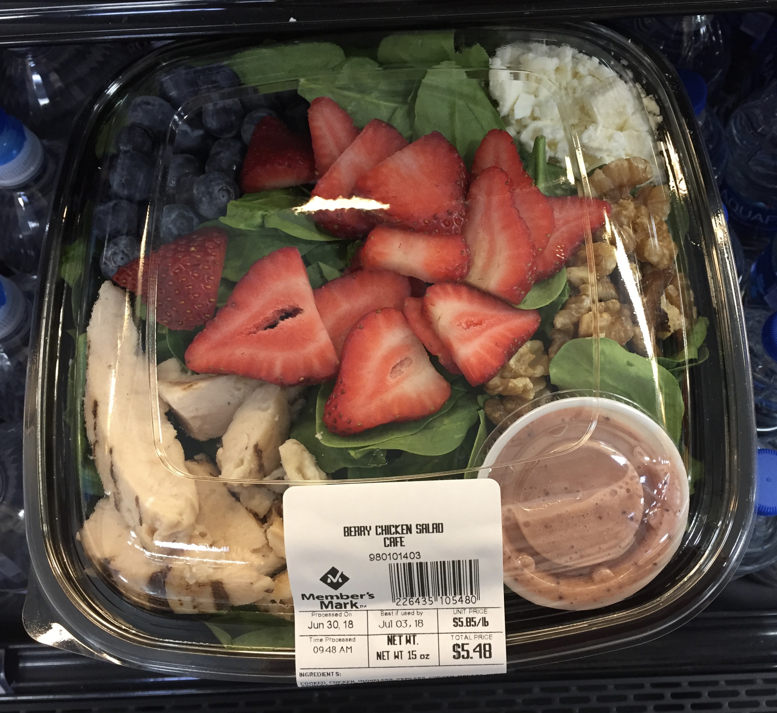 We want to remind you that this is cheap. Our total bill was $2.69. This is in a western suburb of Denver, Colorado. Prices vary by location, but if you are on a road trip, eating can get expensive. Sam’s Club can give you financial relief. Of course, while on road trips, we often eat at small local restaurants, but sometimes we just don’t want much. And this much food today, was really too much. If you are a Sam’s Club member, check out the snack bar. They have 16 inch pizzas for $8.99. They had really great looking salads, with chicken and ripe strawberries, blueberries and walnuts. And only $5.48.