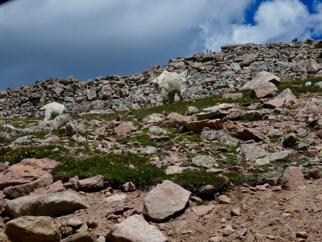 As we approach the summit of Mt. Evans, these Mountain Goats are wandering.   Humans do stop to admire and photograph the animals.