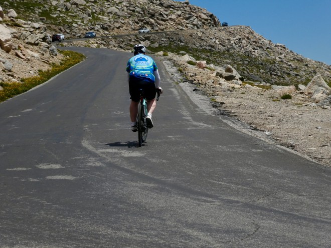 Our Bristlecone Pines do not get as old as those in California and Nevada because our growing conditions are too good.   They like more wind, more cold, and less moisture.   And we think our winters at this altitude are pretty brutal for growing things.  We are driving our car here, but some people enjoy the challenge of riding a bicycle.  You may notice there are few trees here.   We are approaching timber line.   Above here, the conditions prevent trees and most vegetation from growing.