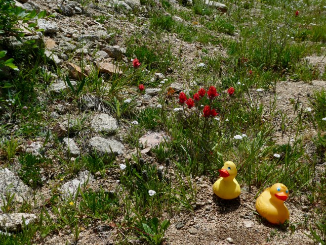 I, Zeb the Duck, love red wildflowers.   If you did not drive to the summit of Mt. Evans this summer, we hope you plan to go next summer.   It is beautiful and you pass through so many climate levels.   You will be above tree line.   You will see arctic tundra.   We hope to see you there next summer.