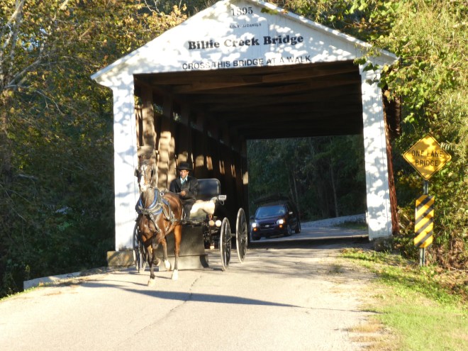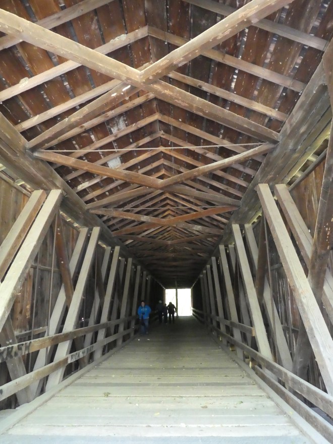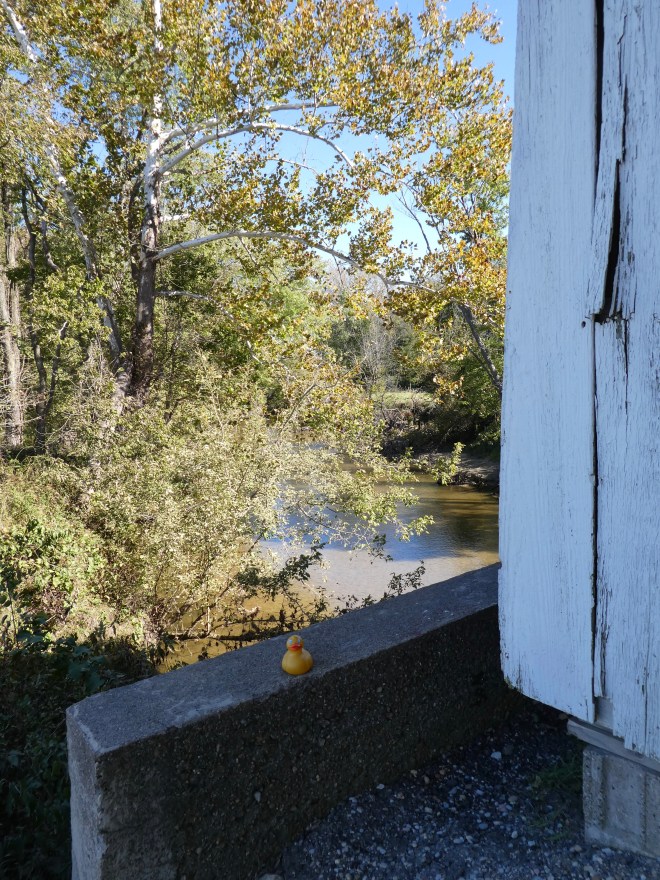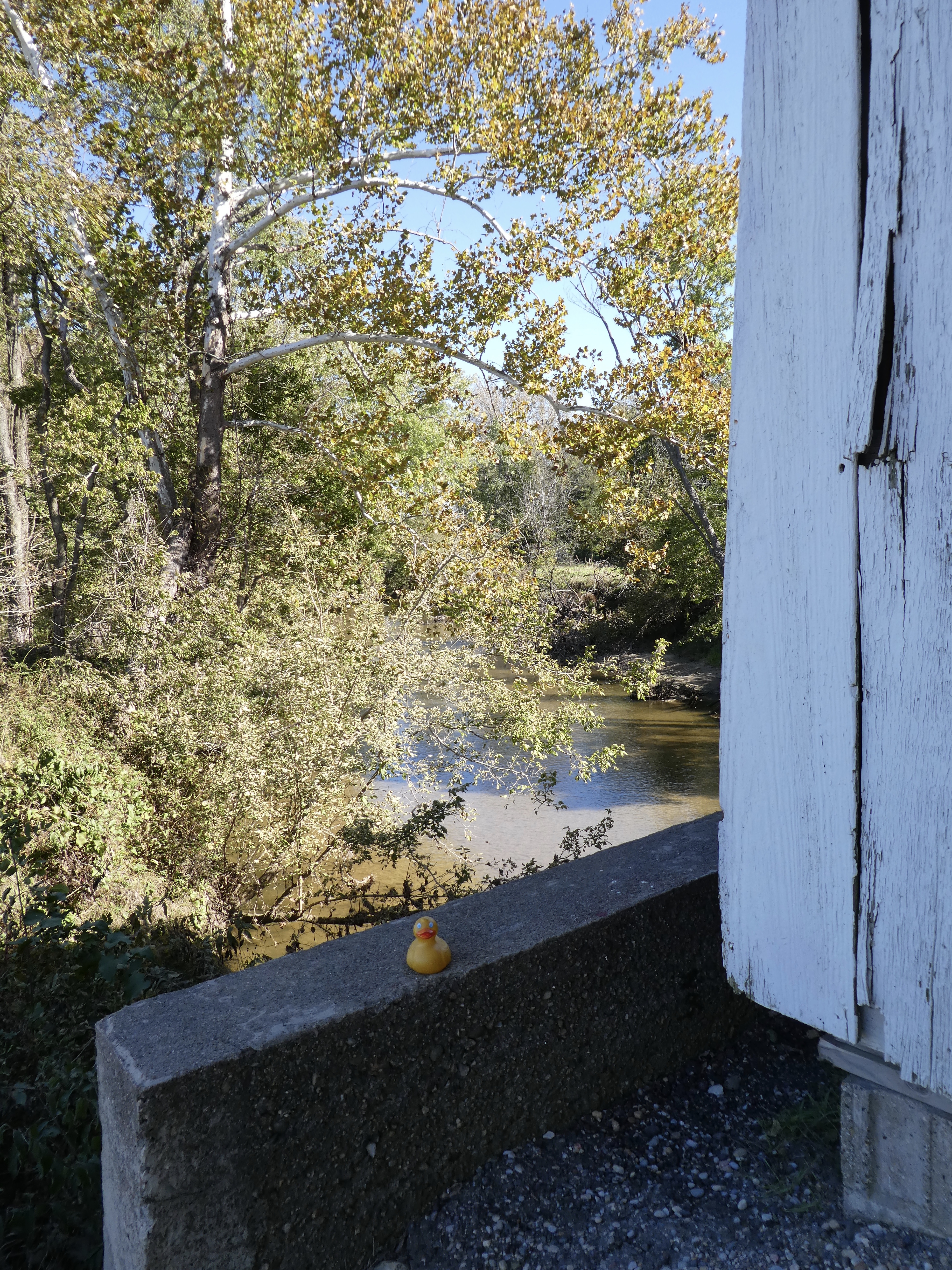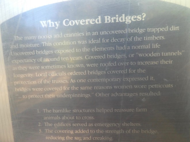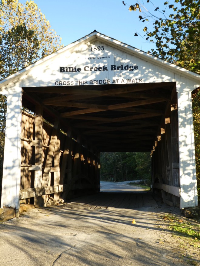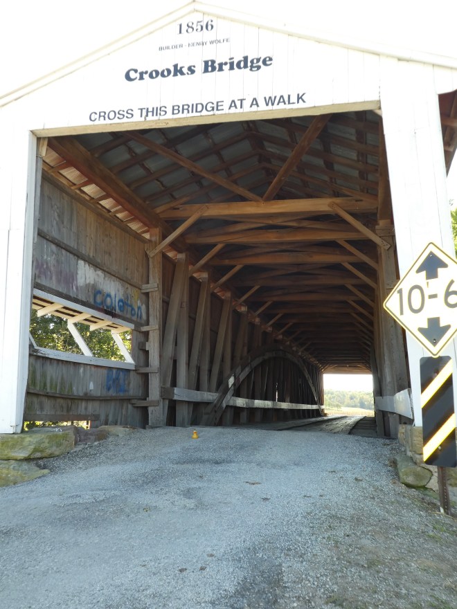 Plenty of space for 2,600 people, but too crowded for hundreds of thousands or even millions. This county in Indiana has at least 31 covered bridges. The Visitor’s Center provides maps, with 4 recommended routes. Humans can drive all over the county, following the suggested routes, to experience driving through covered bridges. We found some bridges Sunday night, but did more driving Monday morning. Here is Crooks Bridge.