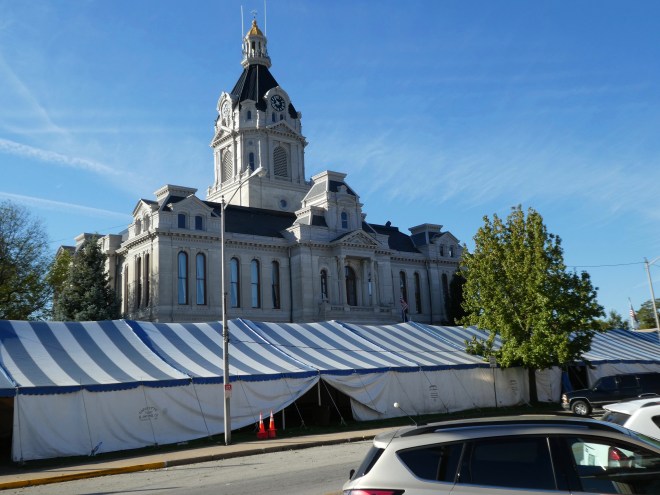 But now I, Zeb the Duck, understand. Horses are to pass through the bridge at a walk. Isn’t this a perfect horse pulled cart? Cars, of course, can drive slowly through the bridge. OK, we are here in Rockville, Indiana as the Covered Bridge Festival is ending. The town of Rockville had a population of 2,600 people according to the 2010 census. A nice, small town. But the covered bridge festival begins the second Friday in October and lasts 10 days. During that time, there will be about 2 million visitors, according to the website. That is a lot of people! Let’s look around town first. The courthouse is a majestic old building.