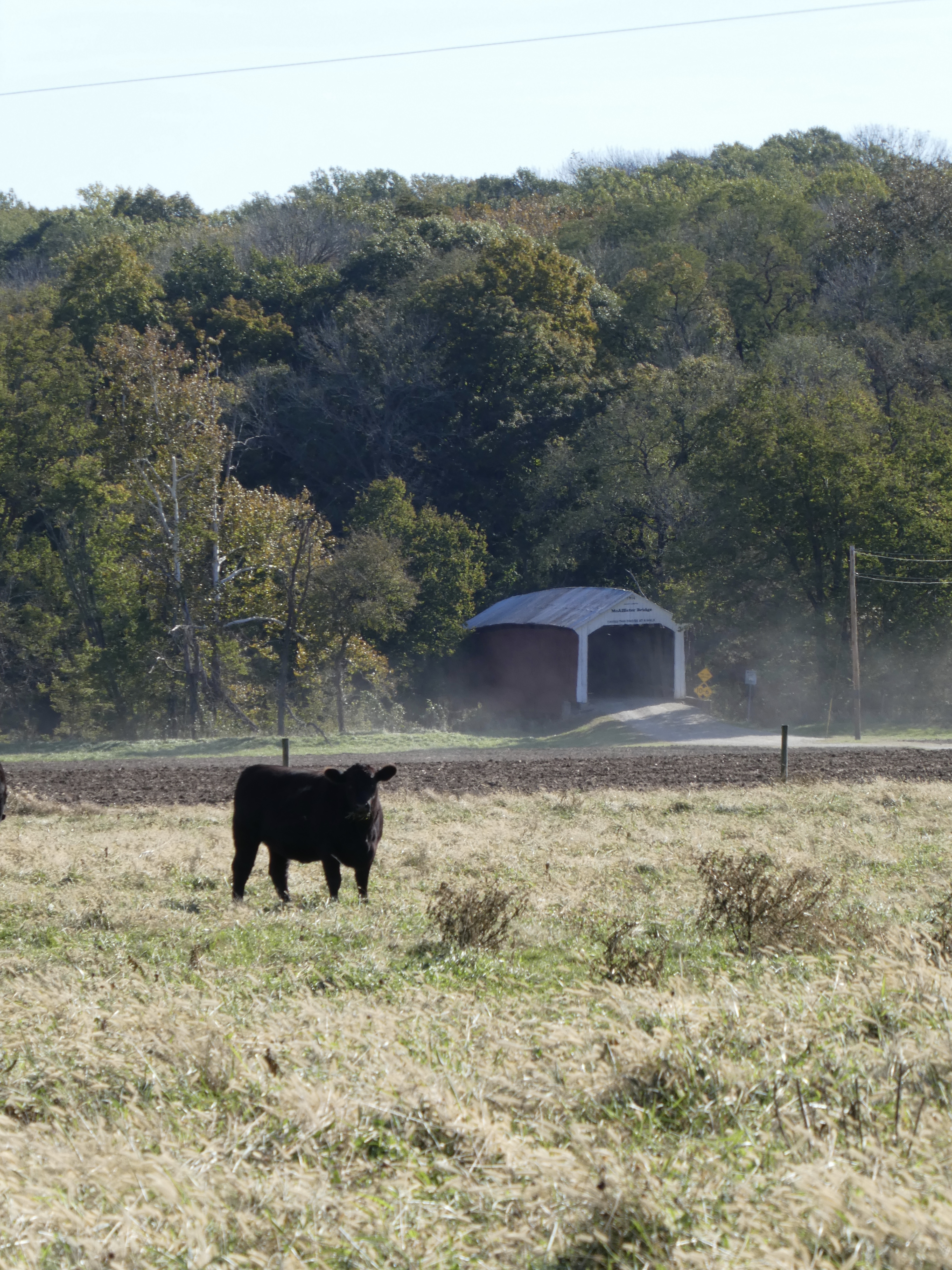 You can see the dust from a car that just drove through the covered bridge. Of course, farms mean cows, and we like cows.