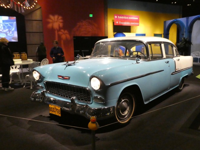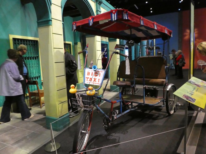 Cubans still have old cars from the United States. Those built in the 1950s and early 1960s. The Cuban people have developed incredible mechanical skills. They cannot get original parts for replacements, so they improvise. The automobiles still run and are in great condition. These large American cars are very popular as Cuban taxis now. In recent years, Americans have been able to visit Cuba on approved tours, if requirements are met. I, Zeb the Duck, and mom visited Cuba in December 2013. The exhibit in Denver shows many things we saw on the streets of Havana. Cars are scarce and very expensive in Cuba, so bicycle taxis are also popular.