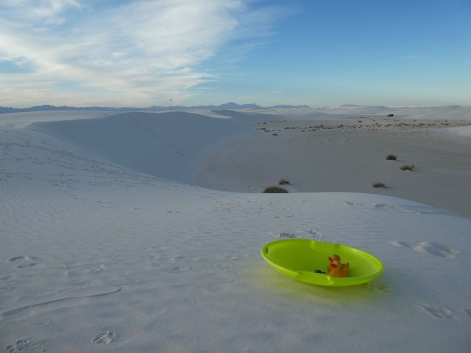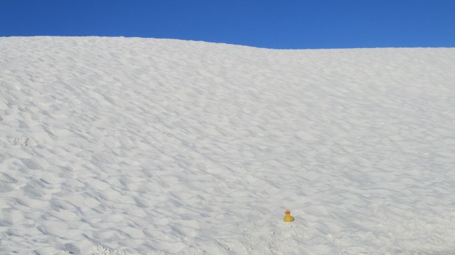 Here comes my mom sledding down the dunes. We ducks went also. Fortunately it was not crowded today. Another family was sledding down a nearby dunes. All the humans were all laughing and having a great time. This white sand is primarily from gypsum. This sand is fairly rare because gypsum dissolves in water, but there is no water here.