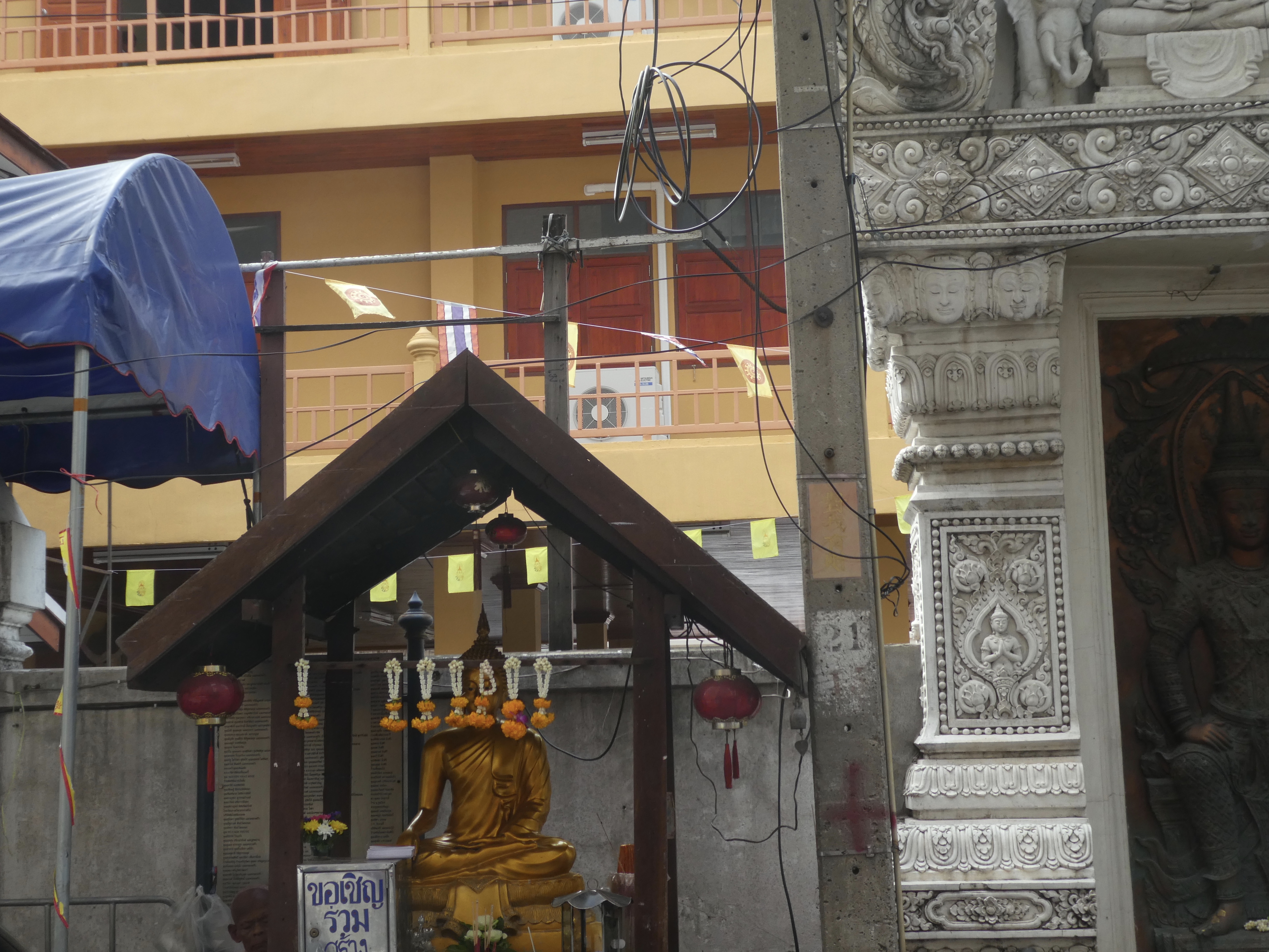 The aromas here are a pleasing combination of flowers and cooking food. Unusual for us, but very appealing. On the street we see tributes to Buddha.