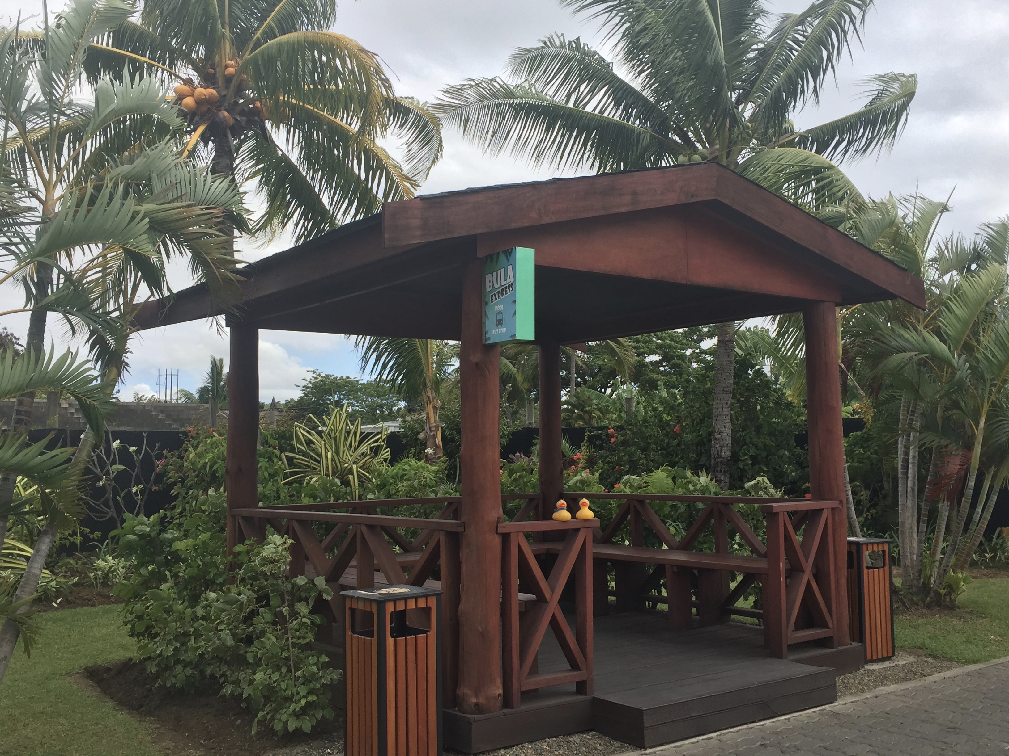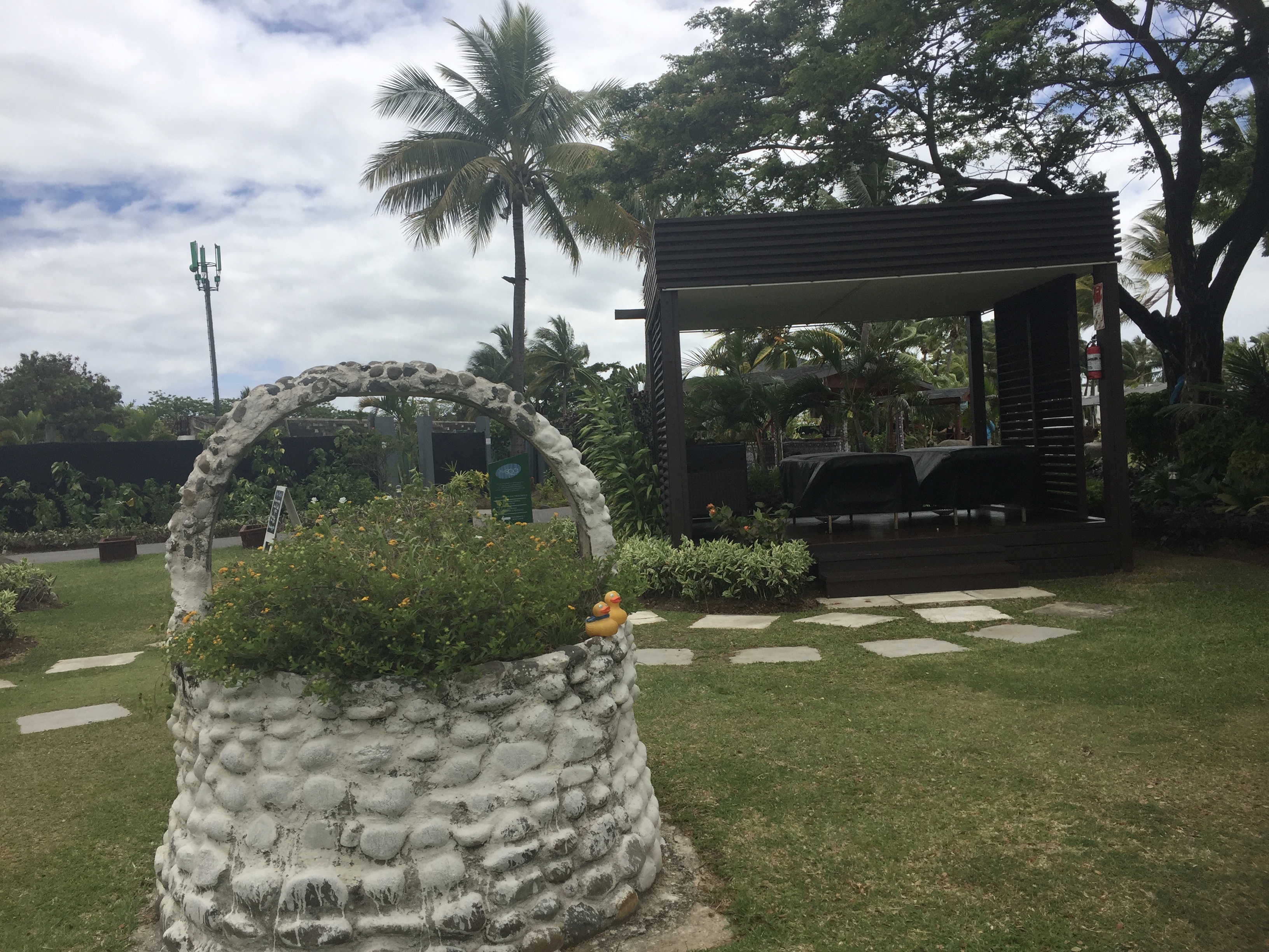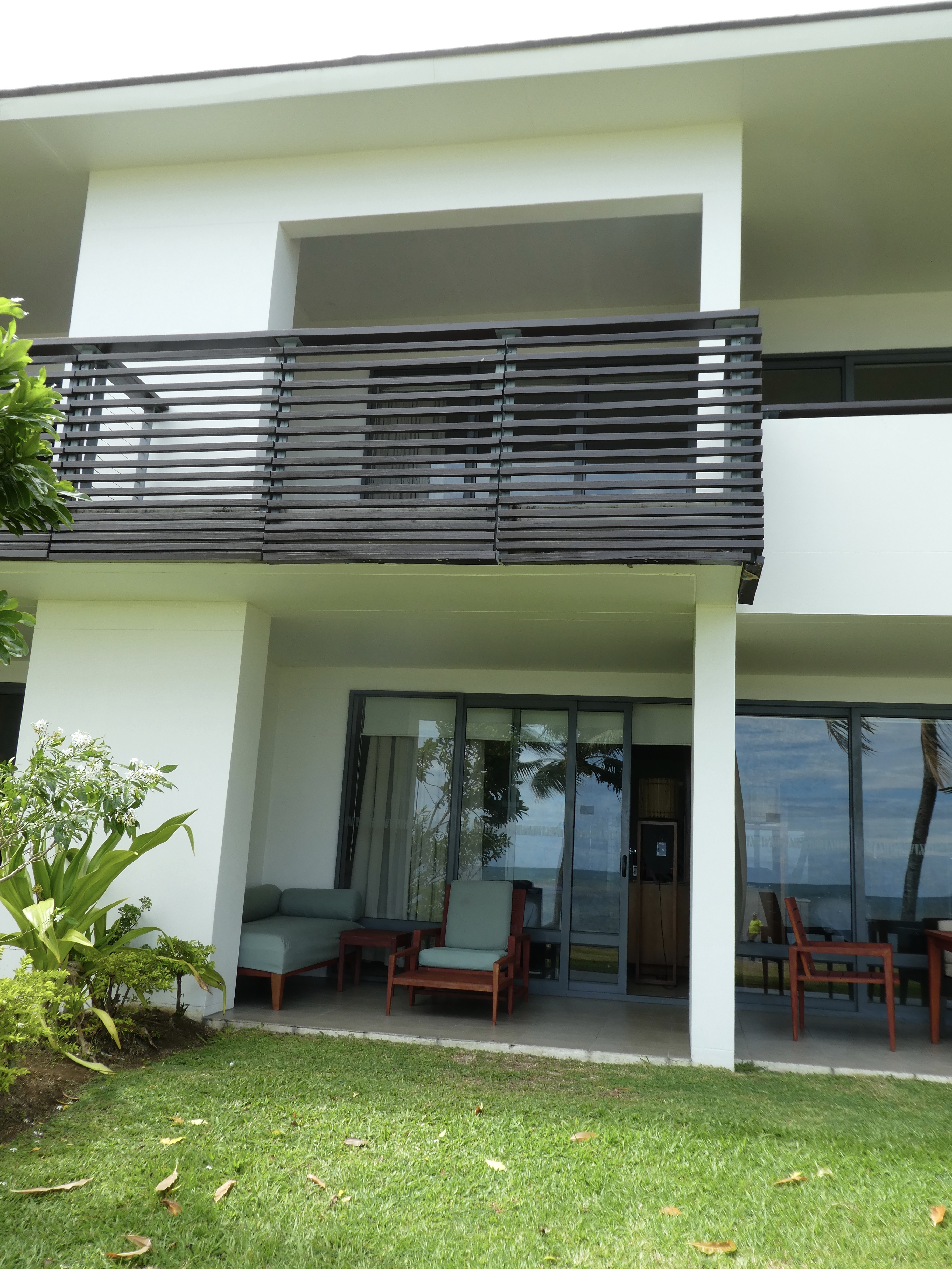 Of course, we need a view of our patio. We are on the ground floor so we can walk out of our room, directly to the beach, pool or restaurants. Hilton Fiji Beach Resort is rather large, so here is our stop for the Bula Express.