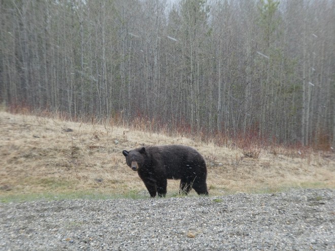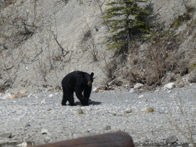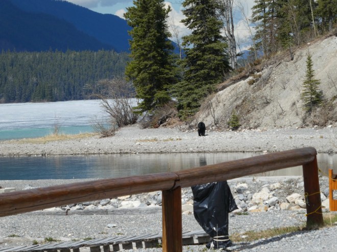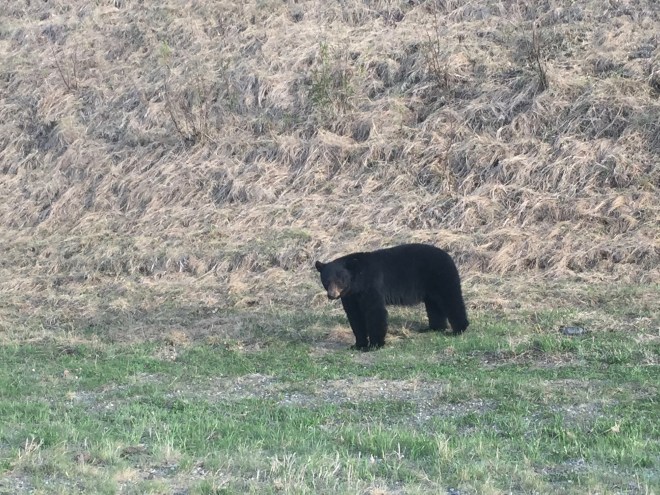 Coming around the bend in the shoreline, a black bear strolls into the lodge grounds. We were just walking there about 30 minutes ago. That is the same curve we saw behind Soapy’s mom carrying our lunch. Did the bear see us, Colorado Traveling Ducks and Chloe? Did he smell our lunch? The bear keeps heading towards us.
