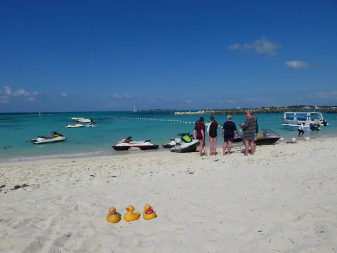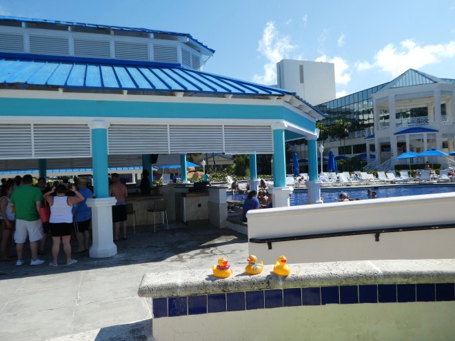Not too crowded either. But, let’s tell you the real reason we are in Nassau now. Remember when we first arrived we said there were other humans we knew and some we were meeting for the first time. One of our Colorado Traveling Ducks, Bucket Duck (he wears the red tie) lives with his dad. We are here for a wedding.