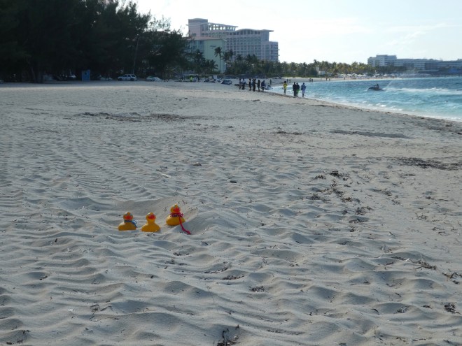 Bucket Duck’s dad got married here in Nassau on the beach at sunset. There were 18 humans and 3 ducks here for the happy occasion. We had a wonderful time. Everybody here was so nice and friendly. After the wedding, everyone stayed a couple days. The guests returned home and the happy couple spent a couple days in Miami, Florida, enjoyed a Caribbean cruise, then a few more days in Miami and finally home. The sunset wedding was beautiful.