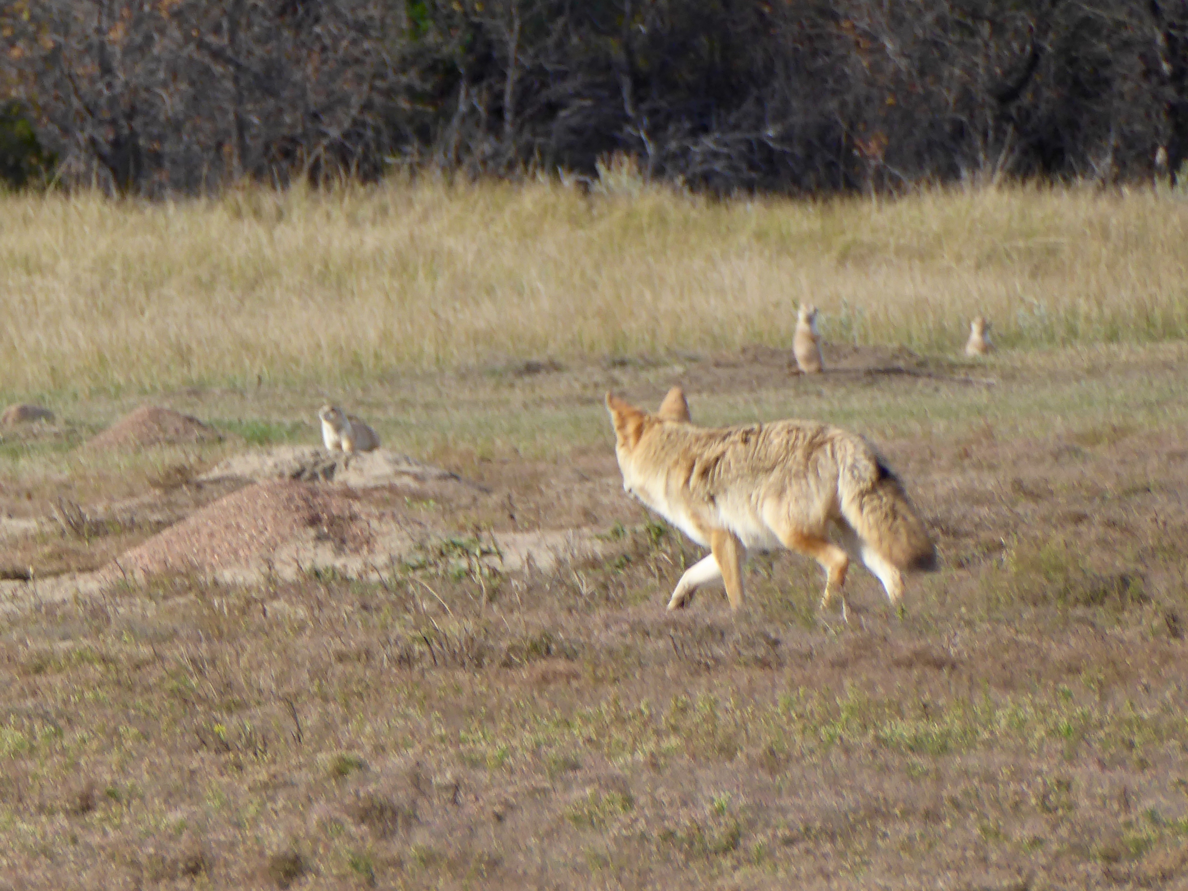 The coyote is walking among the prairie dogs. We hope it is not time for him to eat.